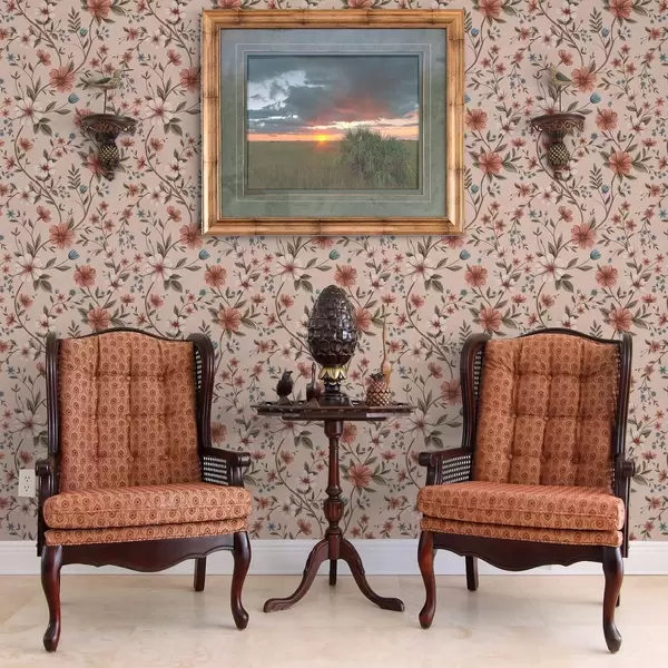 Tapete Rosa-korallenrote Blüten und Blätter auf altrosa Hintergrund a00667