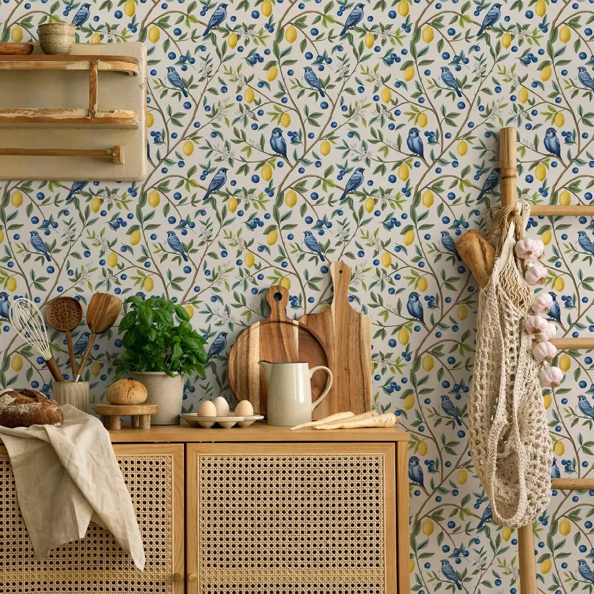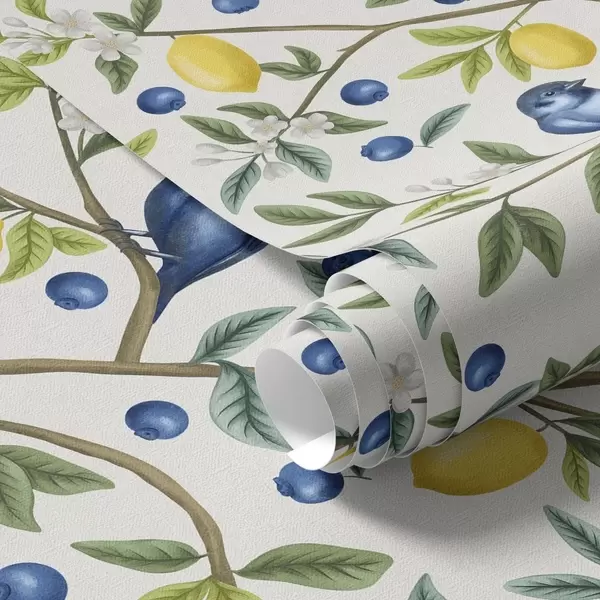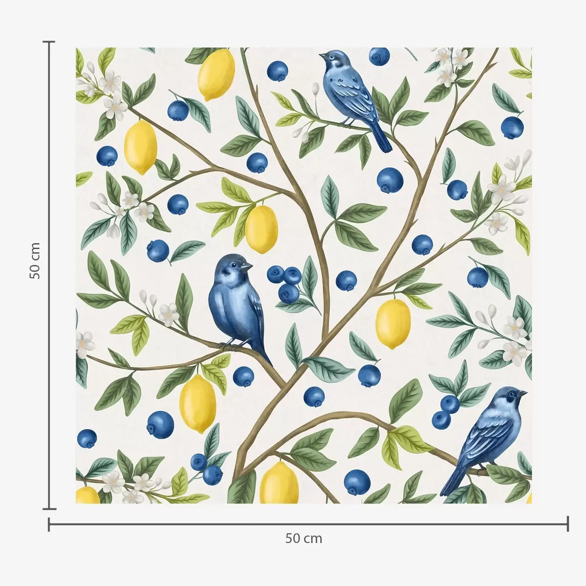 Tapete Blaue Vögel, Zitronen und Beeren auf weißem Hintergrund Nr. a00668
