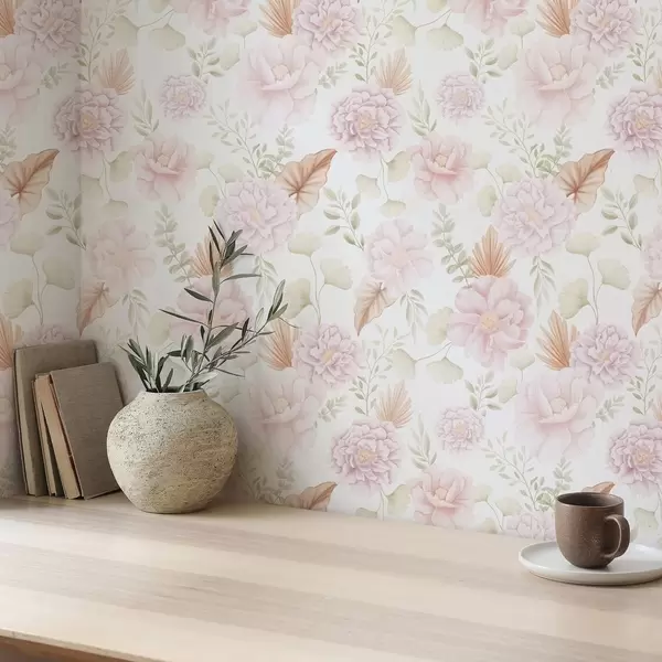 Tapete Zarte pastellfarbene Pfingstrosen und Blätter auf weißem Hintergrund Nr. a00669