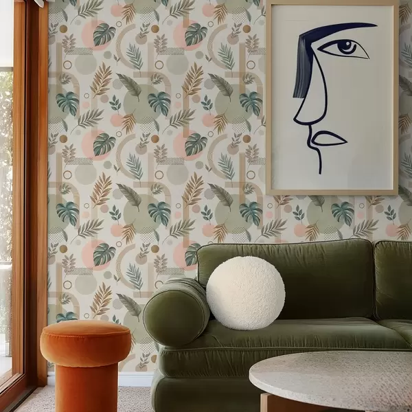 Tapete Blätter und geometrische Formen in ruhigen, warmen Farbtönen Nr. a00677