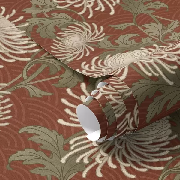 Tapete Cremefarbene Chrysanthemen auf terrakottafarbenem Hintergrund, asiatischer Stil Nr. a00693