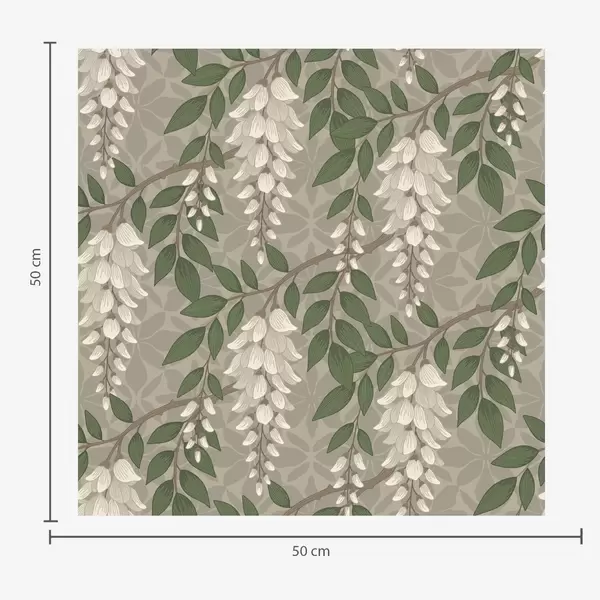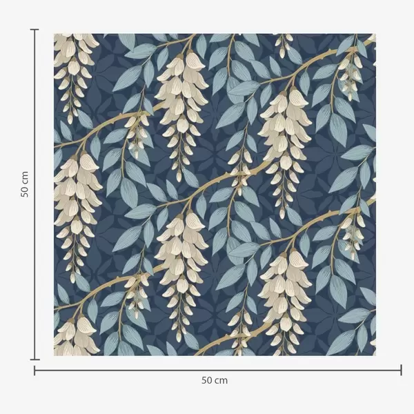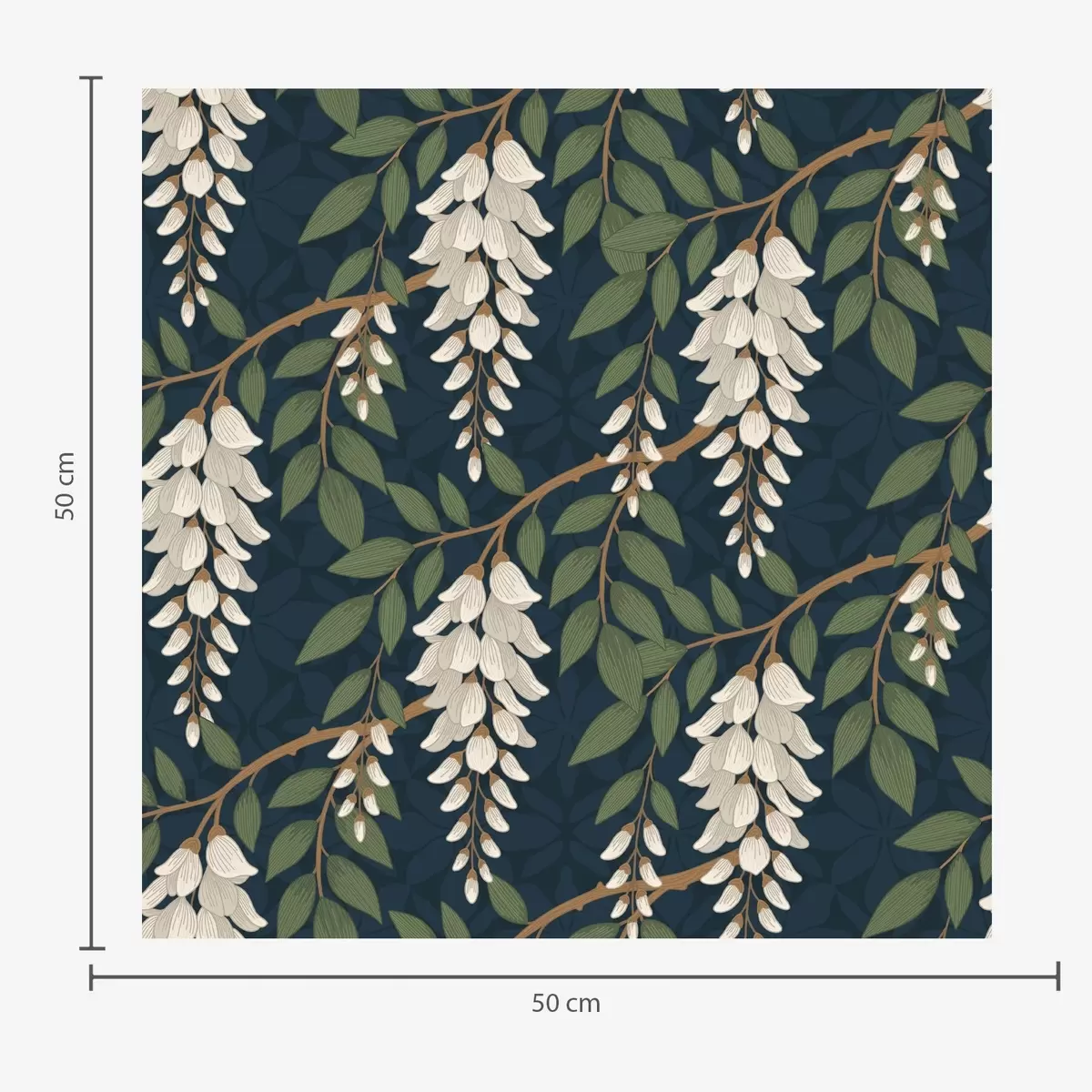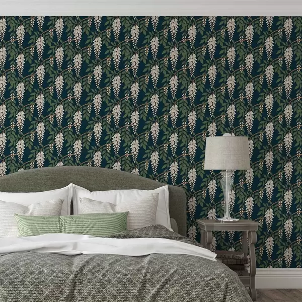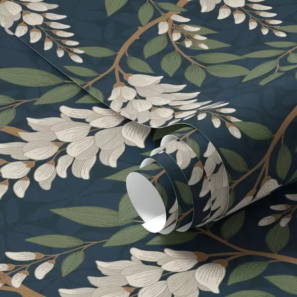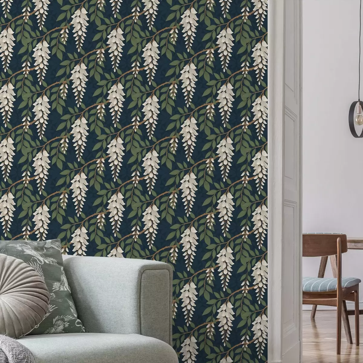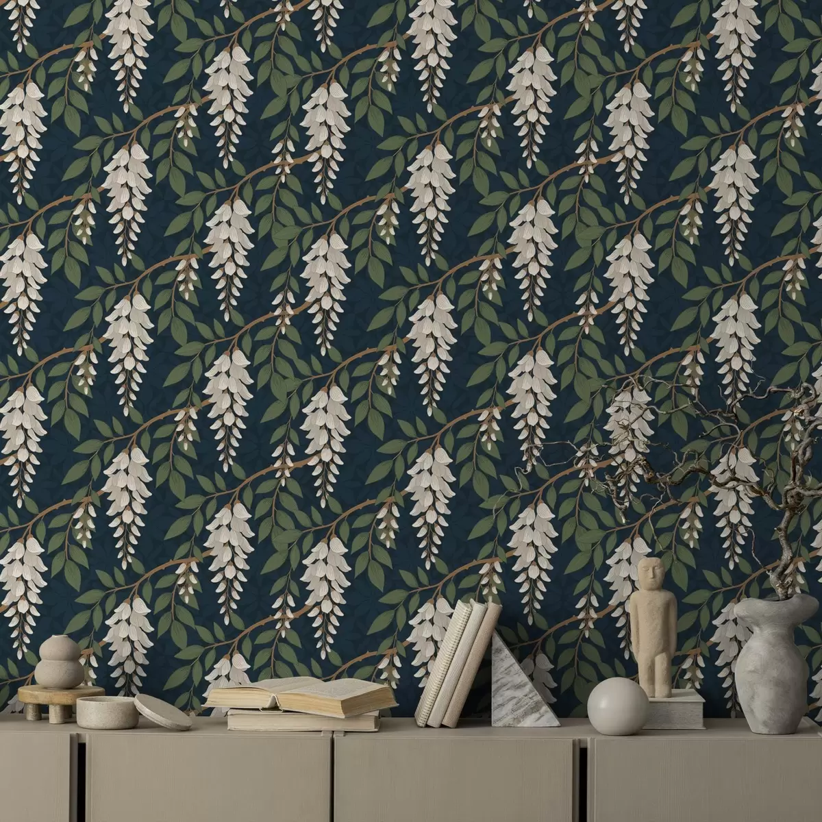 Tapete Elfenbeinfarbene Glyzinien auf tiefem blaugrünem Hintergrund Nr. a00694v1