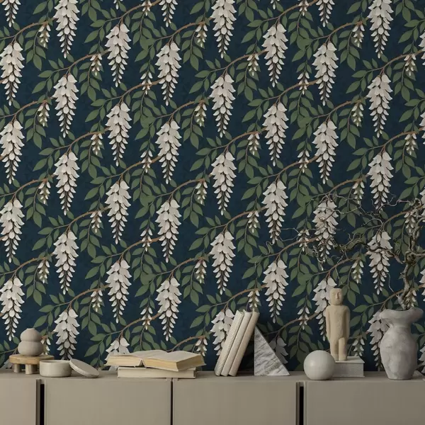 Tapete Elfenbeinfarbene Glyzinien auf tiefem blaugrünem Hintergrund Nr. a00694v1