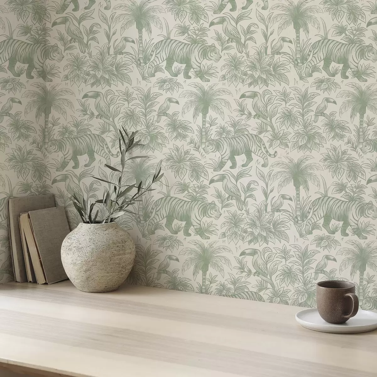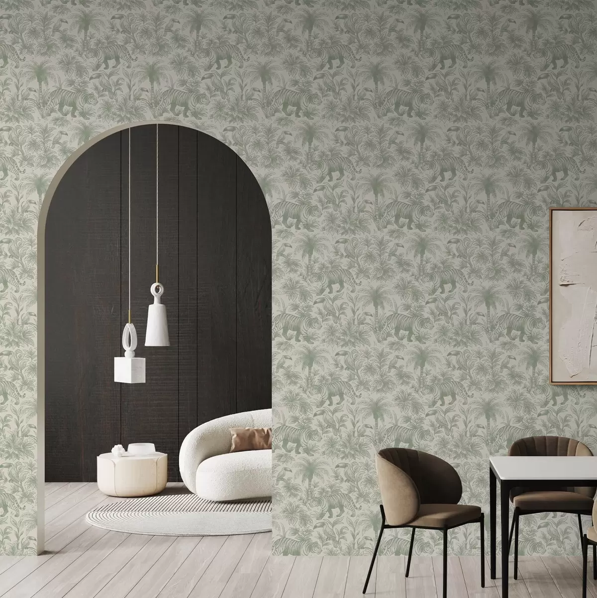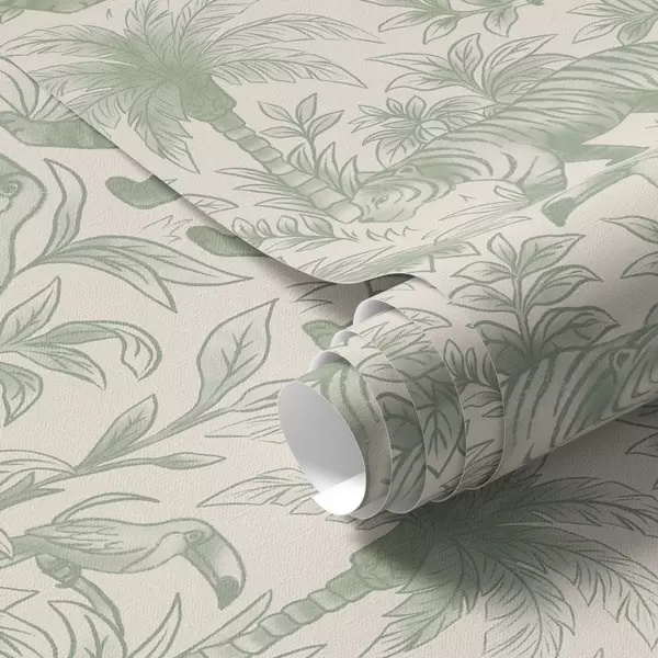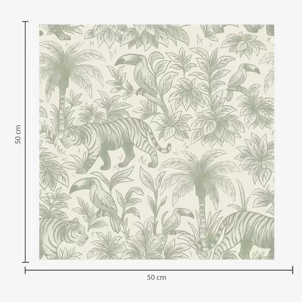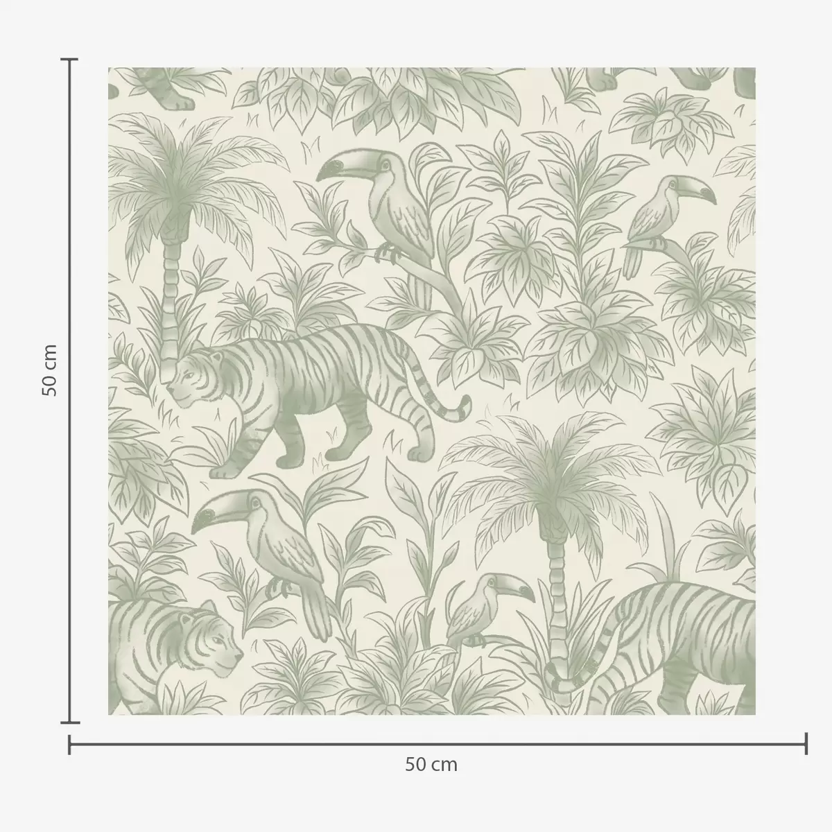 Tapete Tiger und tropische Vögel zwischen Palmen vor hellem Hintergrund Nr. a00711