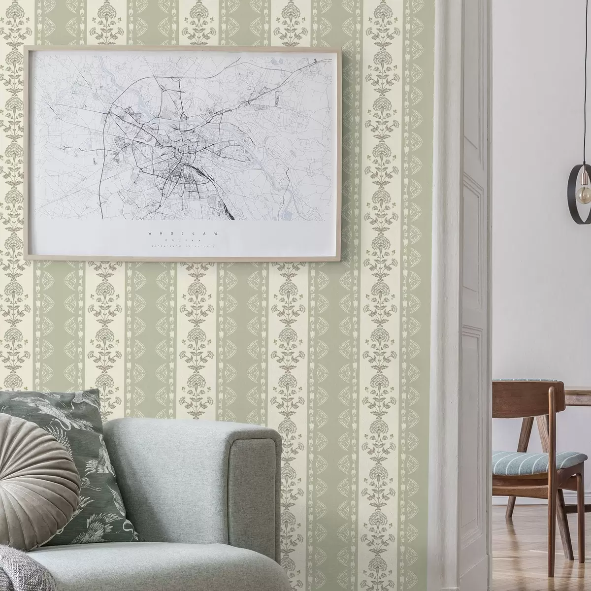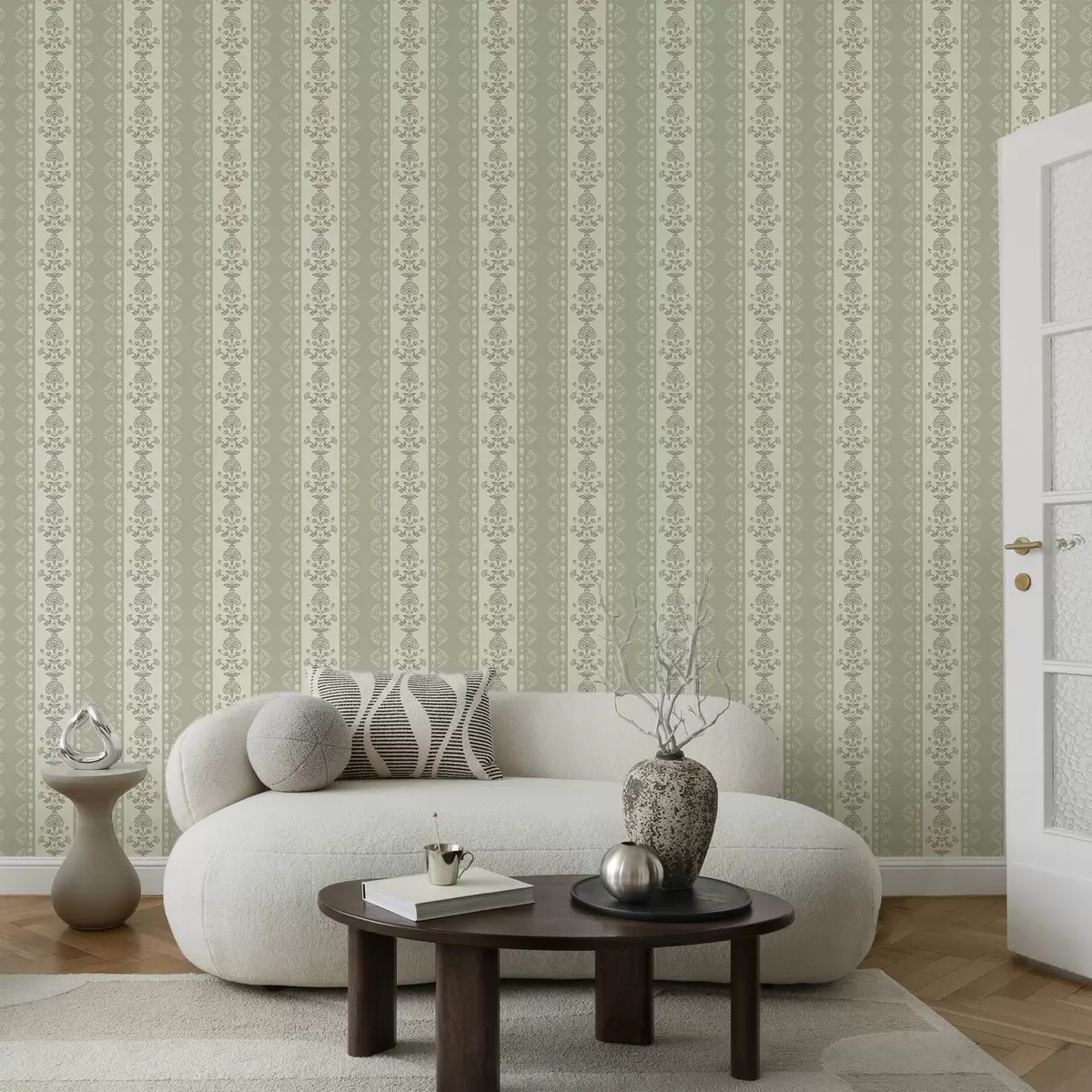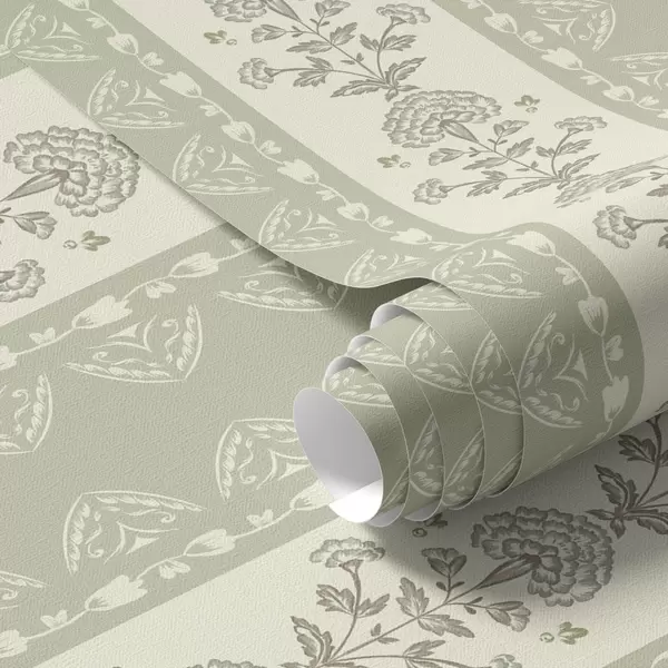 Tapete Gestreiftes Ornament mit floralen Säulen in Salbeifarben Nr. a00719