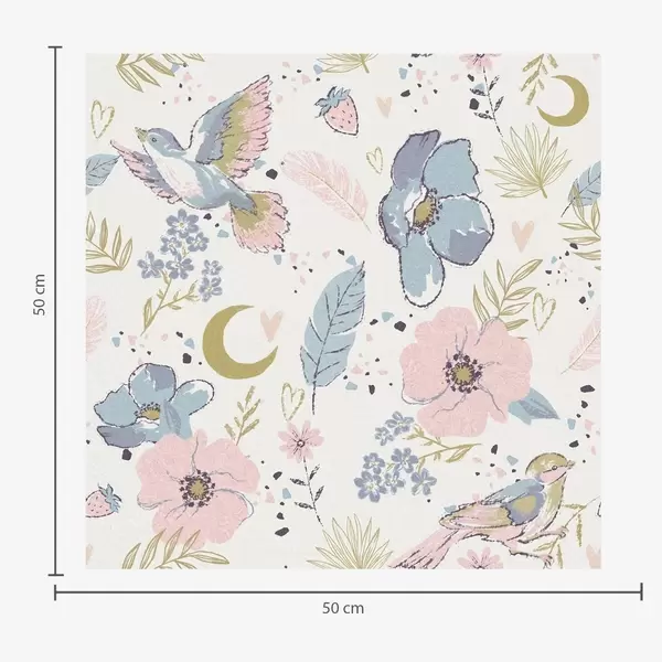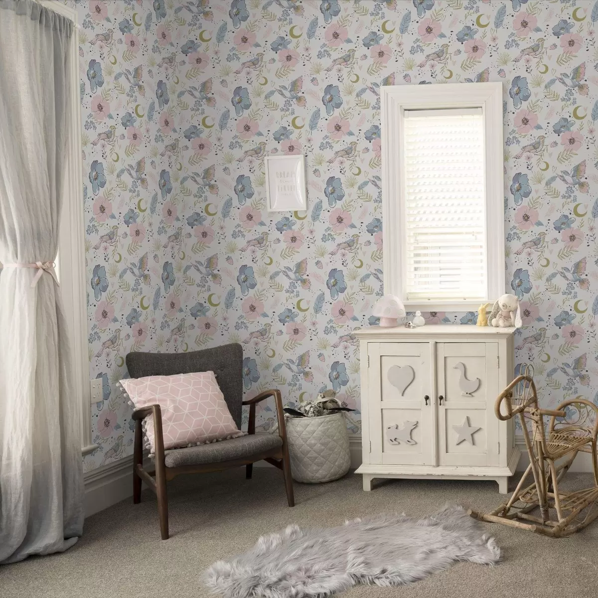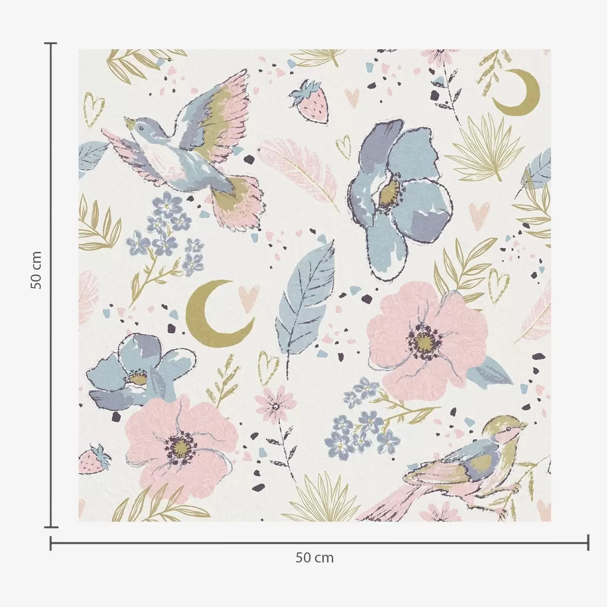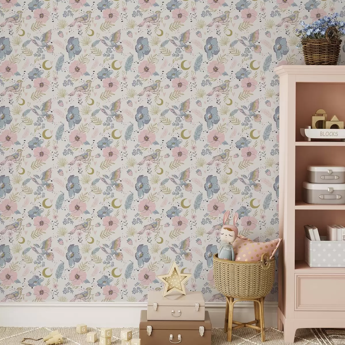 Tapete Pastellfarbene Vögel und Blumen mit Halbmonden auf weißem Hintergrund Nr. a00721