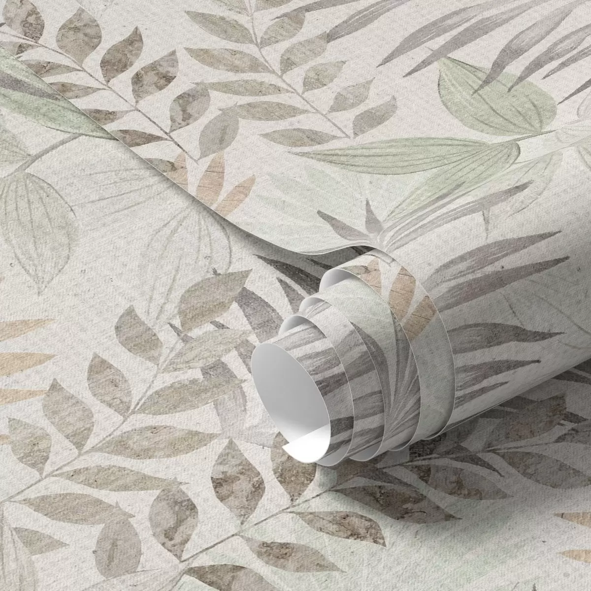 Tapete Pastellfarbene tropische Blätter auf hellem Hintergrund, dezente Textur Nr. a00725