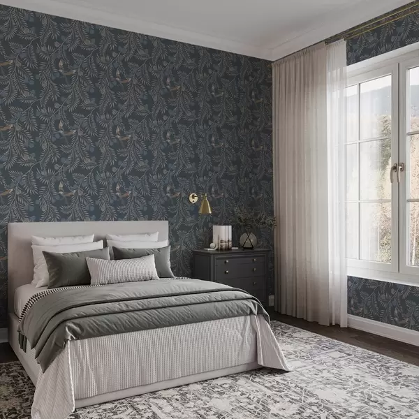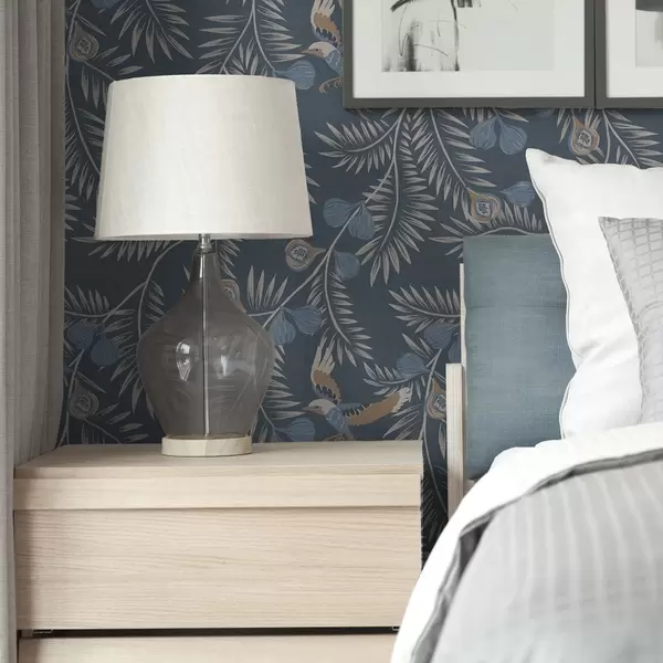 Tapete Vogel zwischen blauen Früchten und Palmblättern, Indigo Nr. a00726