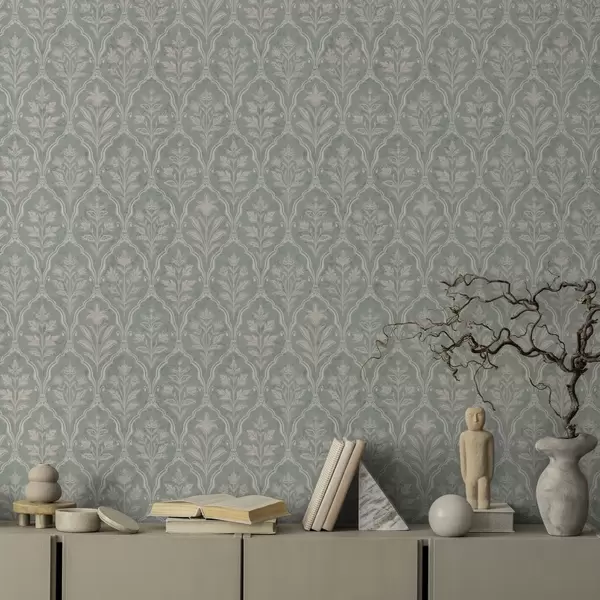 Tapete Minzfarbener Damast mit feinen Blumenmedaillons Nr. a00741