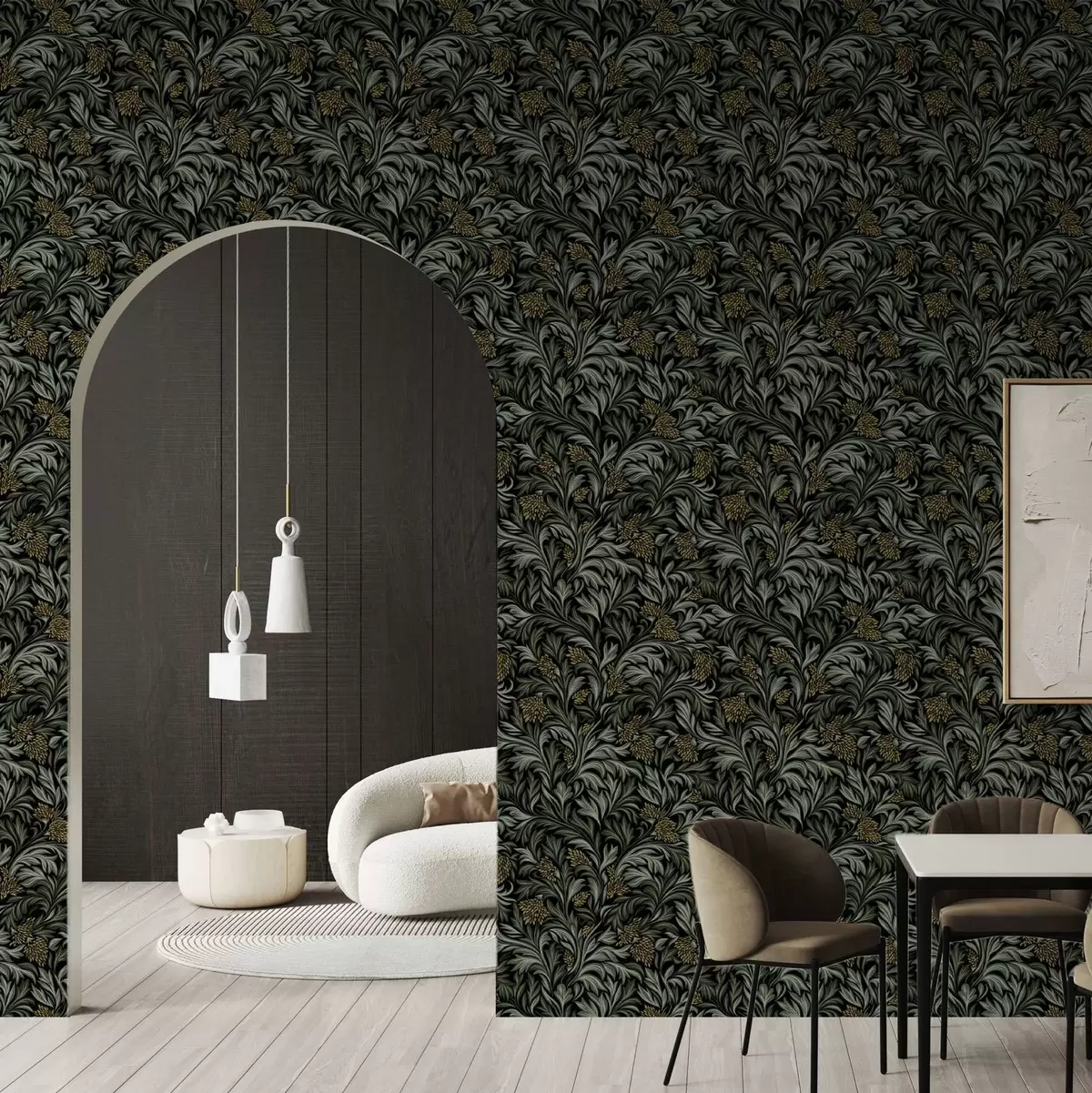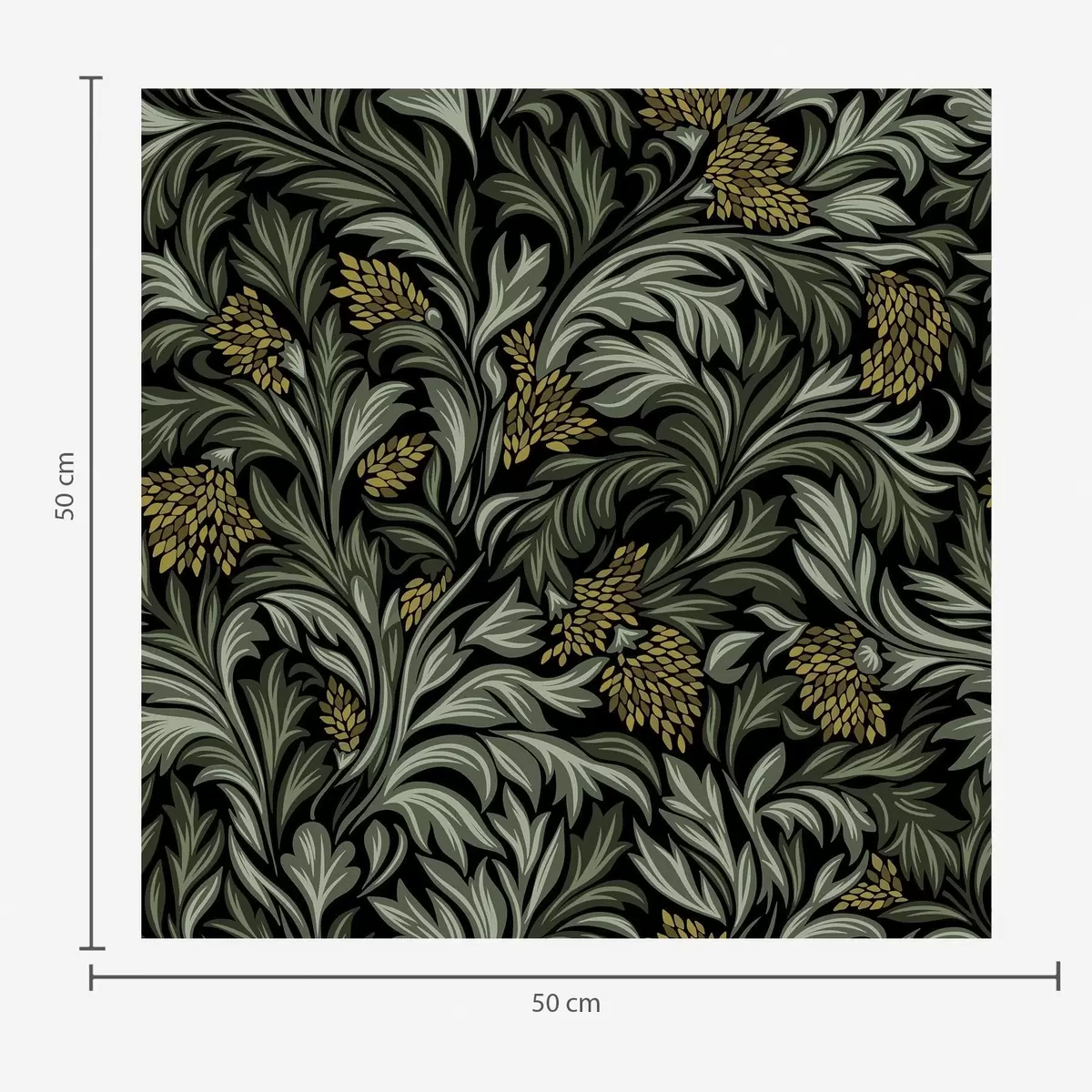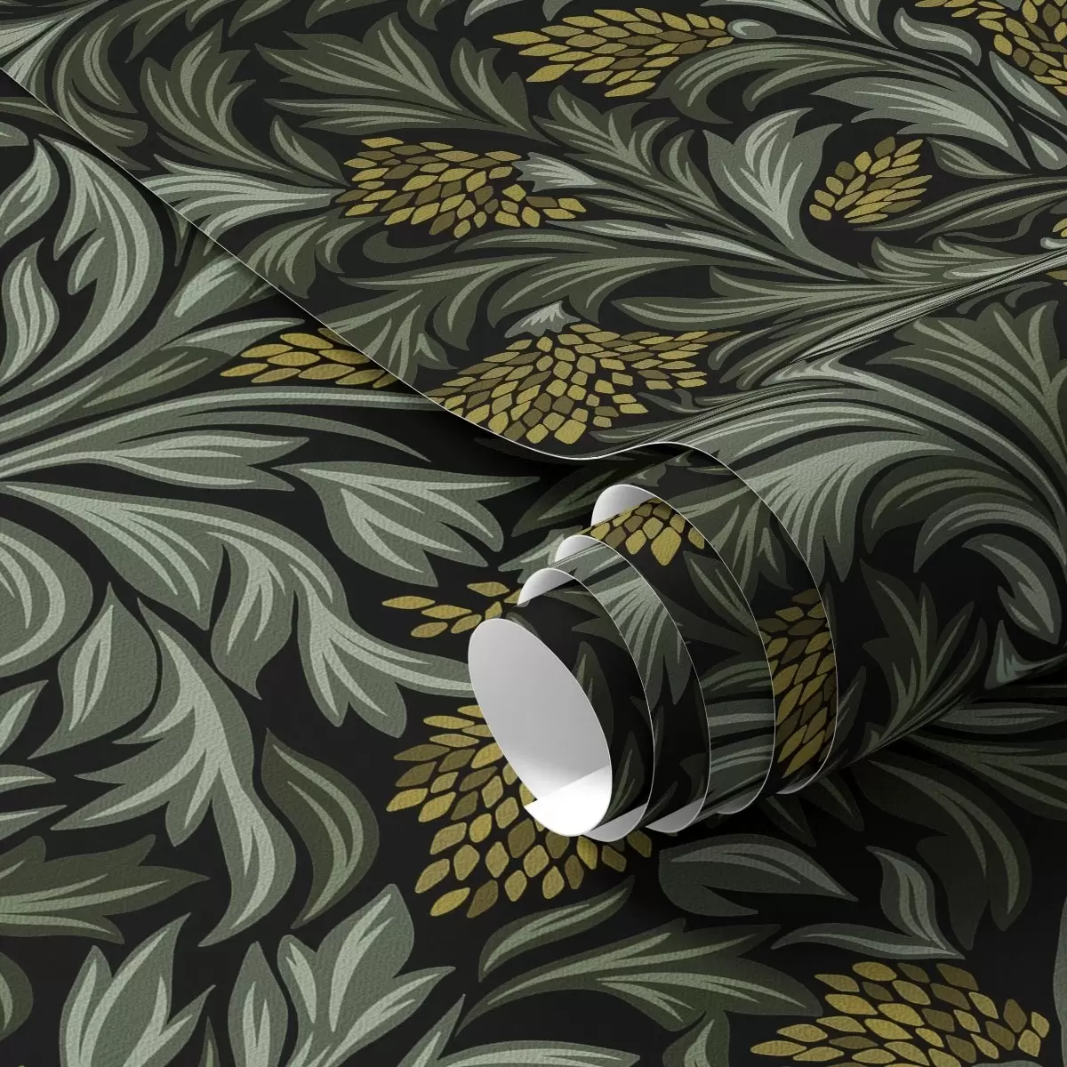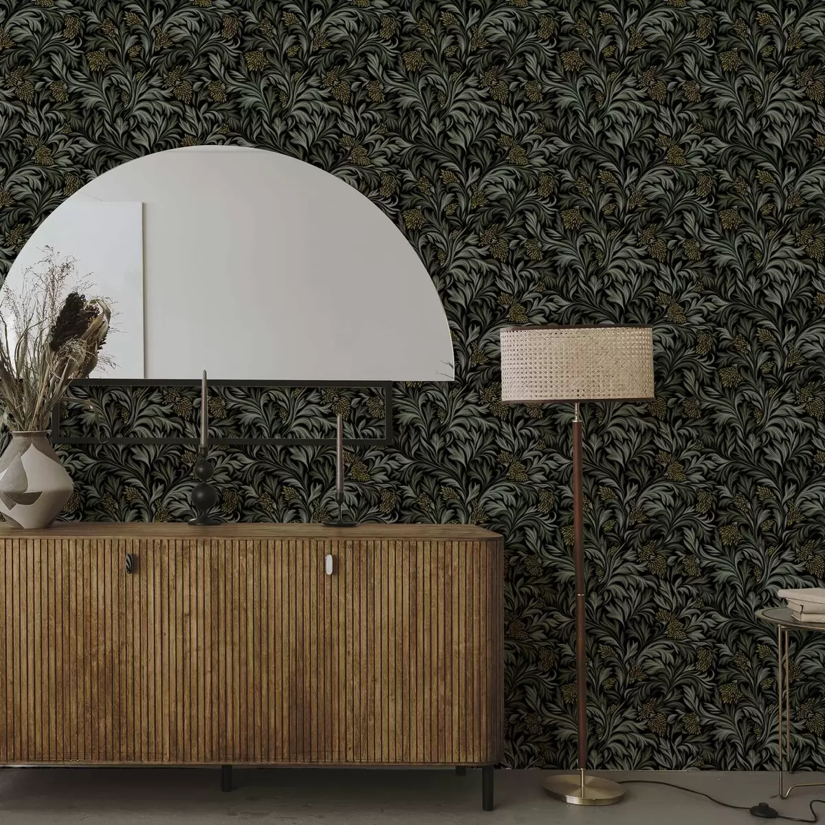 Tapete Dunkle Akanthusblätter mit gelben Zapfen auf schwarzem Hintergrund Nr. a00745