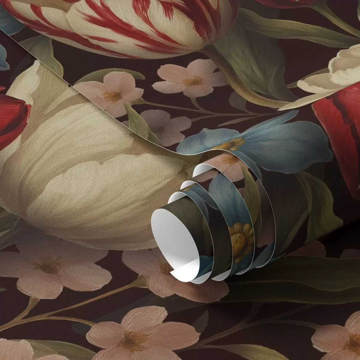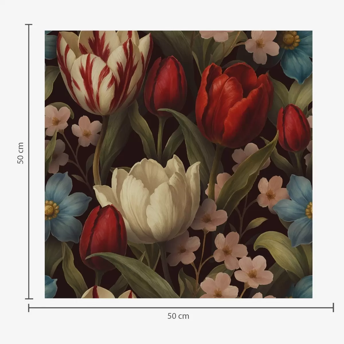 Tapete Leuchtende Tulpen und blaue Blumen auf dunklem Hintergrund Nr. a00746
