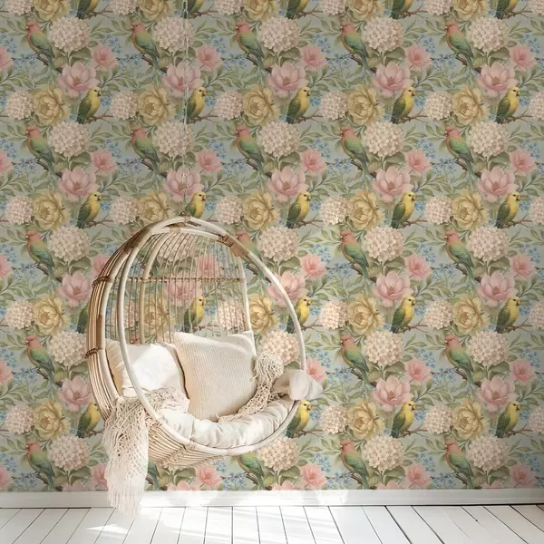 Tapete Papageien zwischen Pfingstrosen, Hortensien und Magnolien Nr. a00747