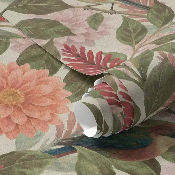 Tapete Vögel zwischen Blumen und Blättern in warmen Farbtönen Nr. a00753