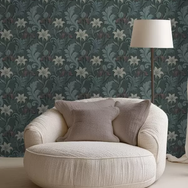 Tapete Dunkelgrüner Hintergrund mit Irisblüten und dekorativen Blättern Nr. a00755