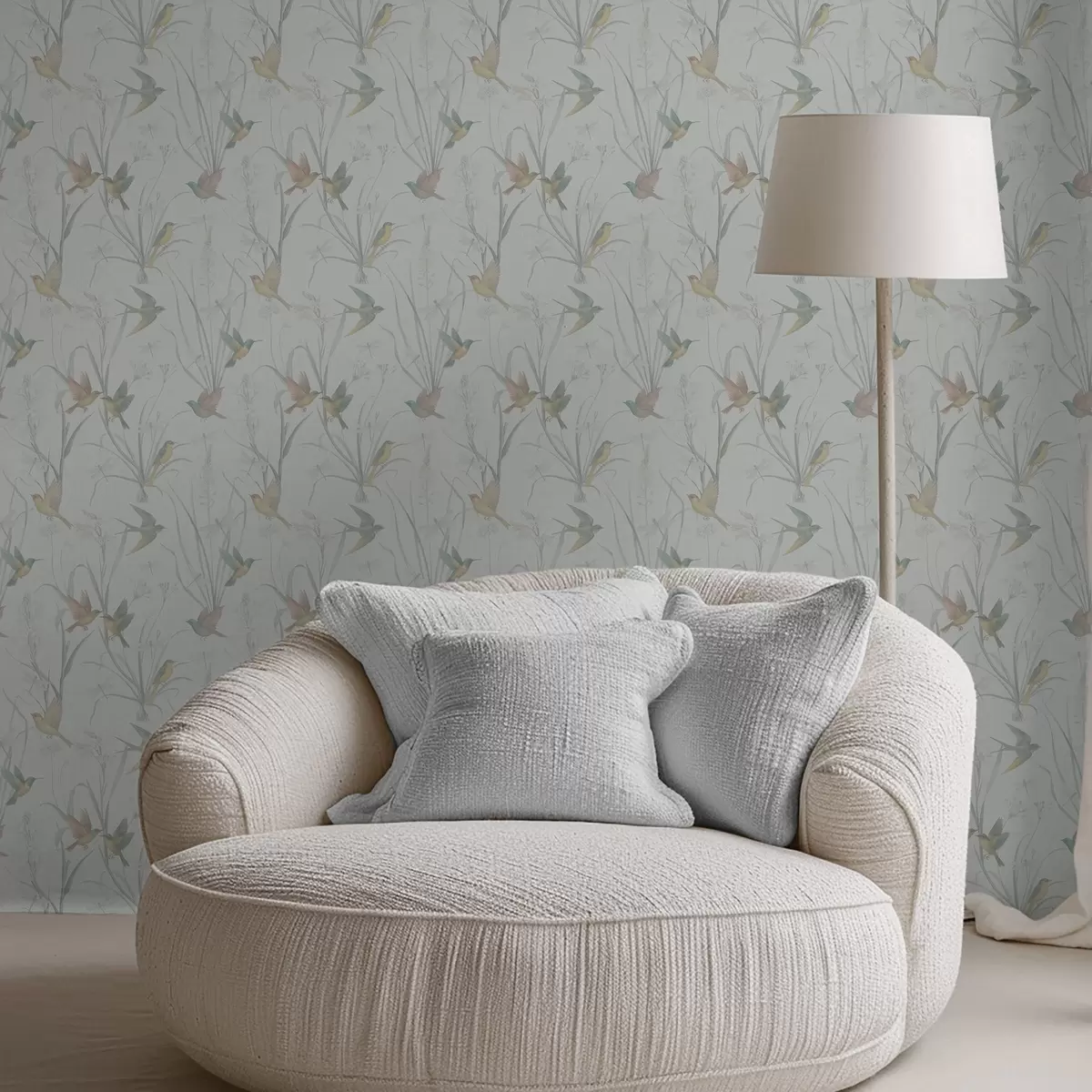 Tapete Vögel zwischen Wiesengräsern auf hellgrauem Hintergrund Nr. a00776v1
