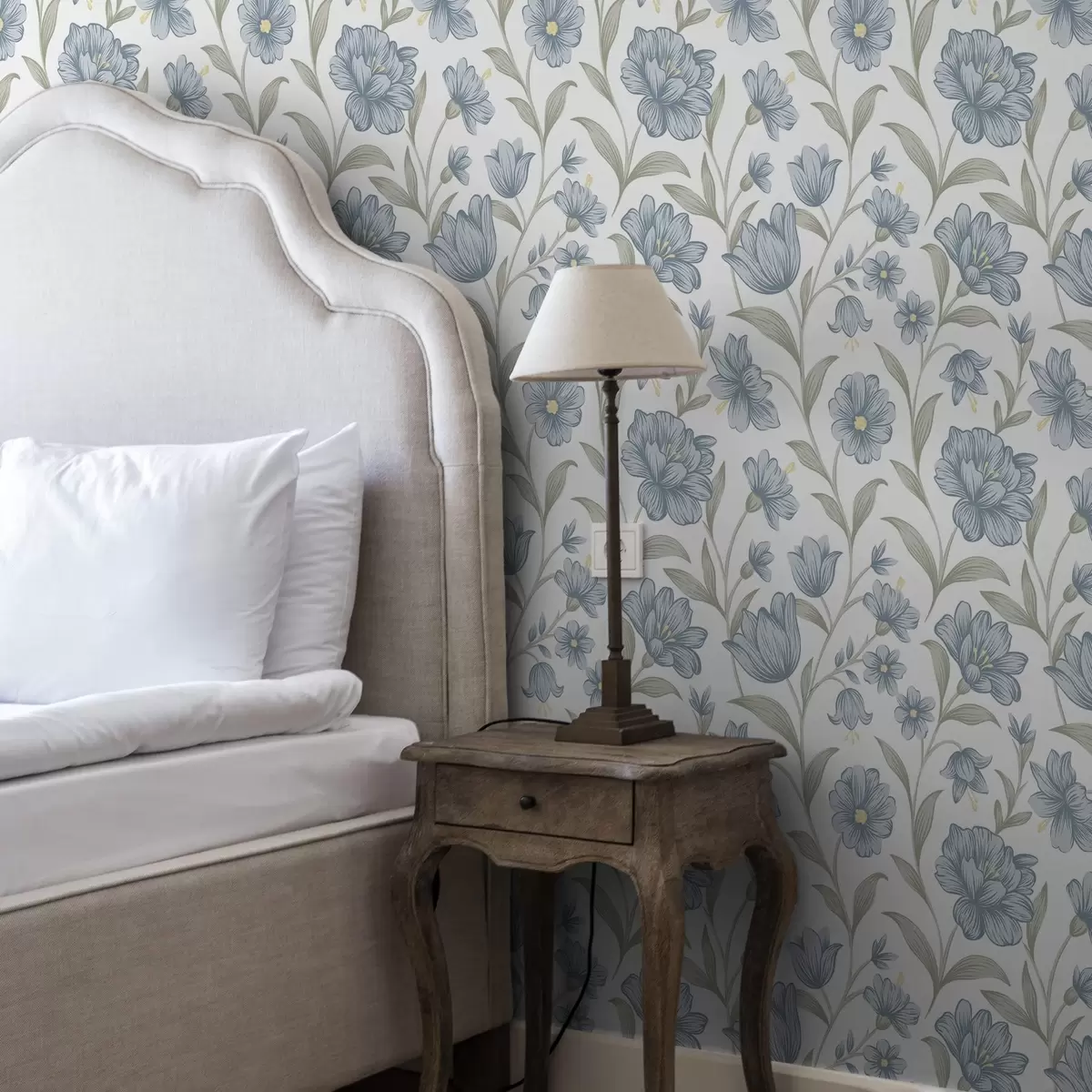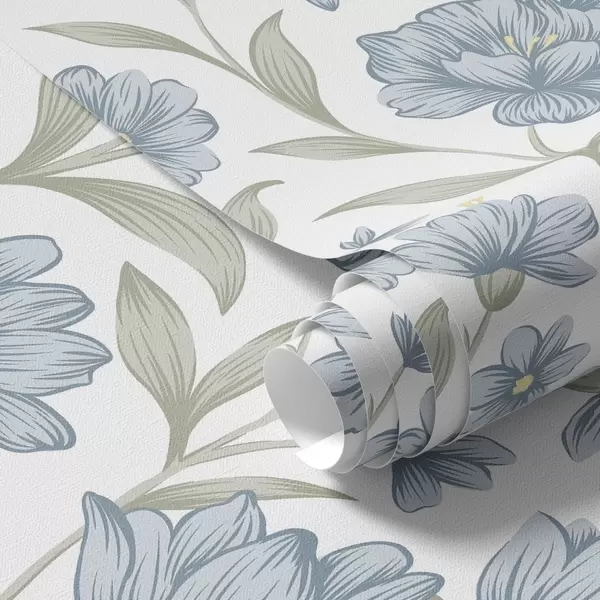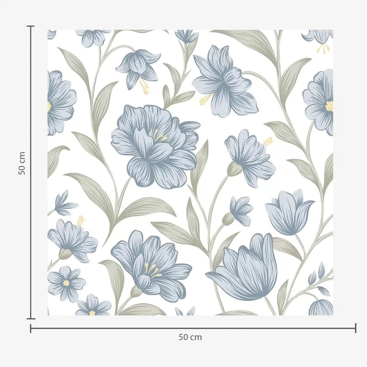 Tapete Staubblaue Blumen mit Olivenblättern auf weißem Hintergrund Nr. a00780