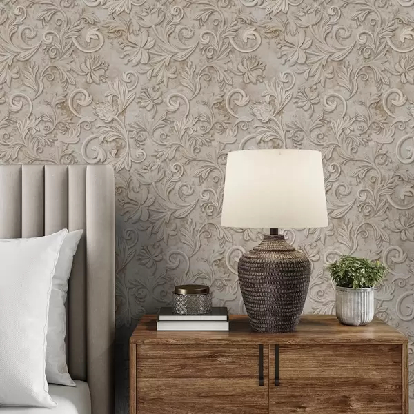 Tapete Steinrelief mit floralen Schnörkeln, Vintage-Beige Nr. a00784