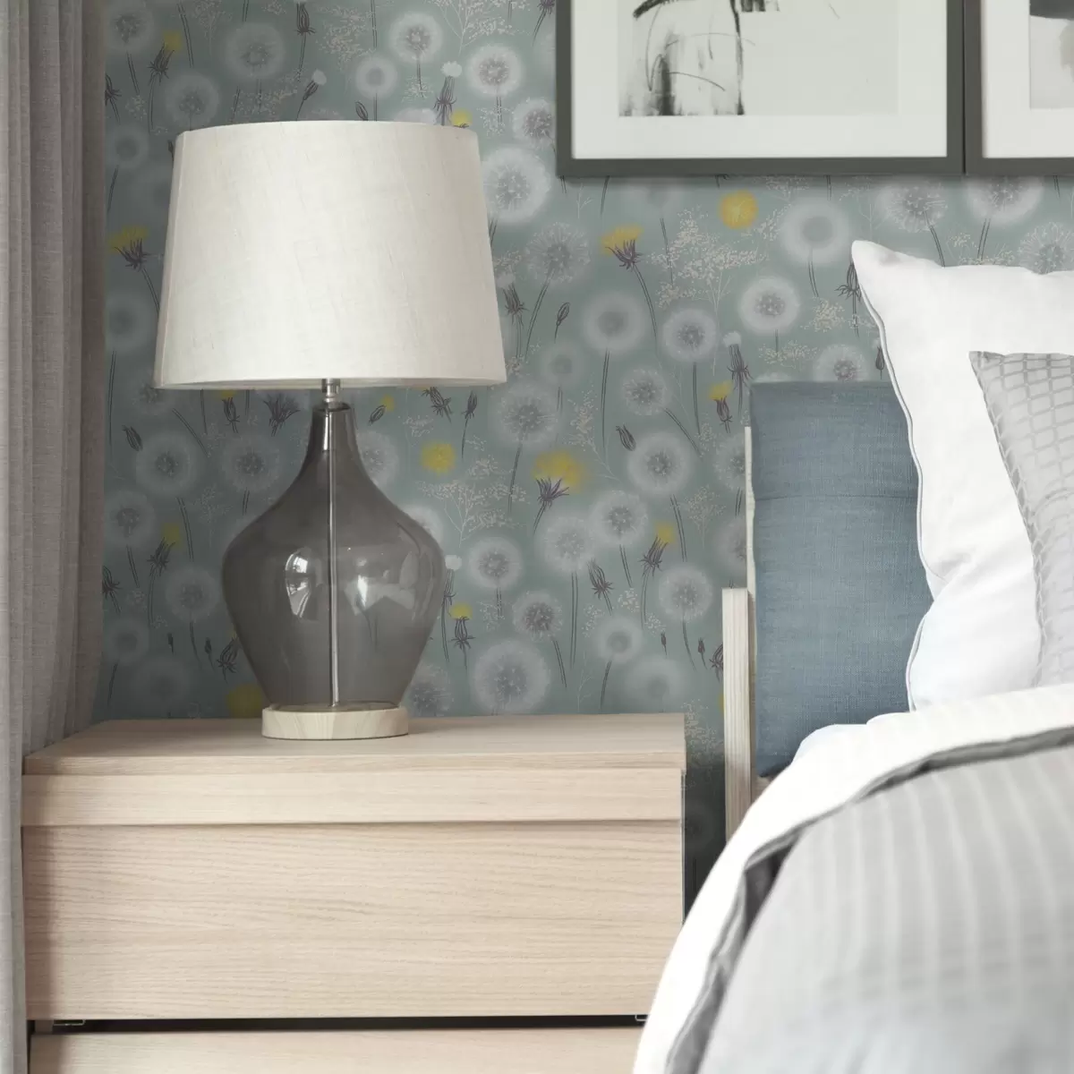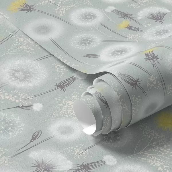Tapete Flauschige Löwenzahnblüten und Samen auf mintfarbenem Hintergrund Nr. a00790