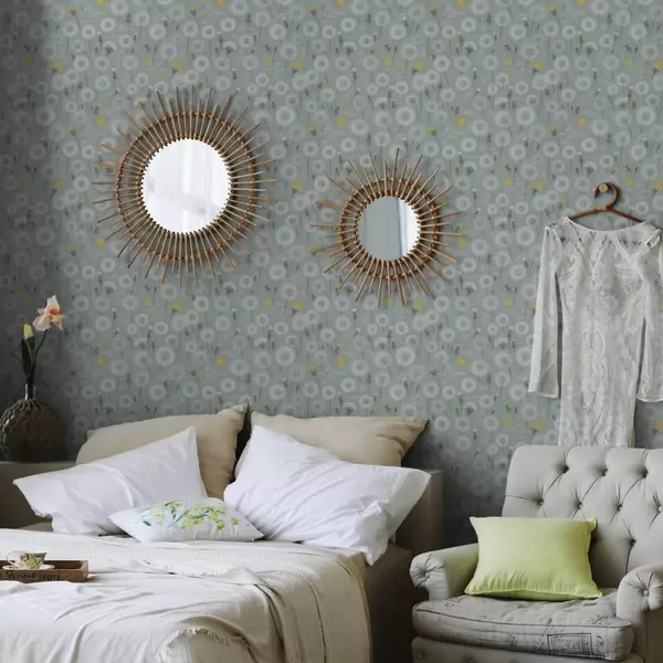 Tapete Flauschige Löwenzahnblüten und Samen auf mintfarbenem Hintergrund Nr. a00790