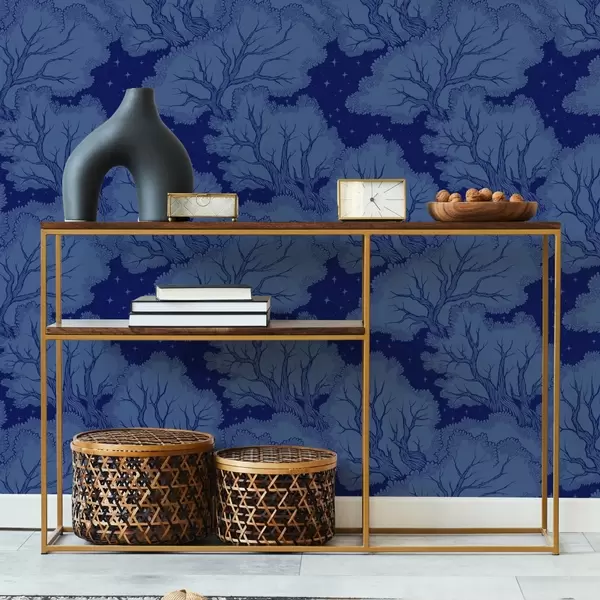 Tapete Silhouetten von Bäumen unter einem Sternenhimmel in Blautönen Nr. a00798