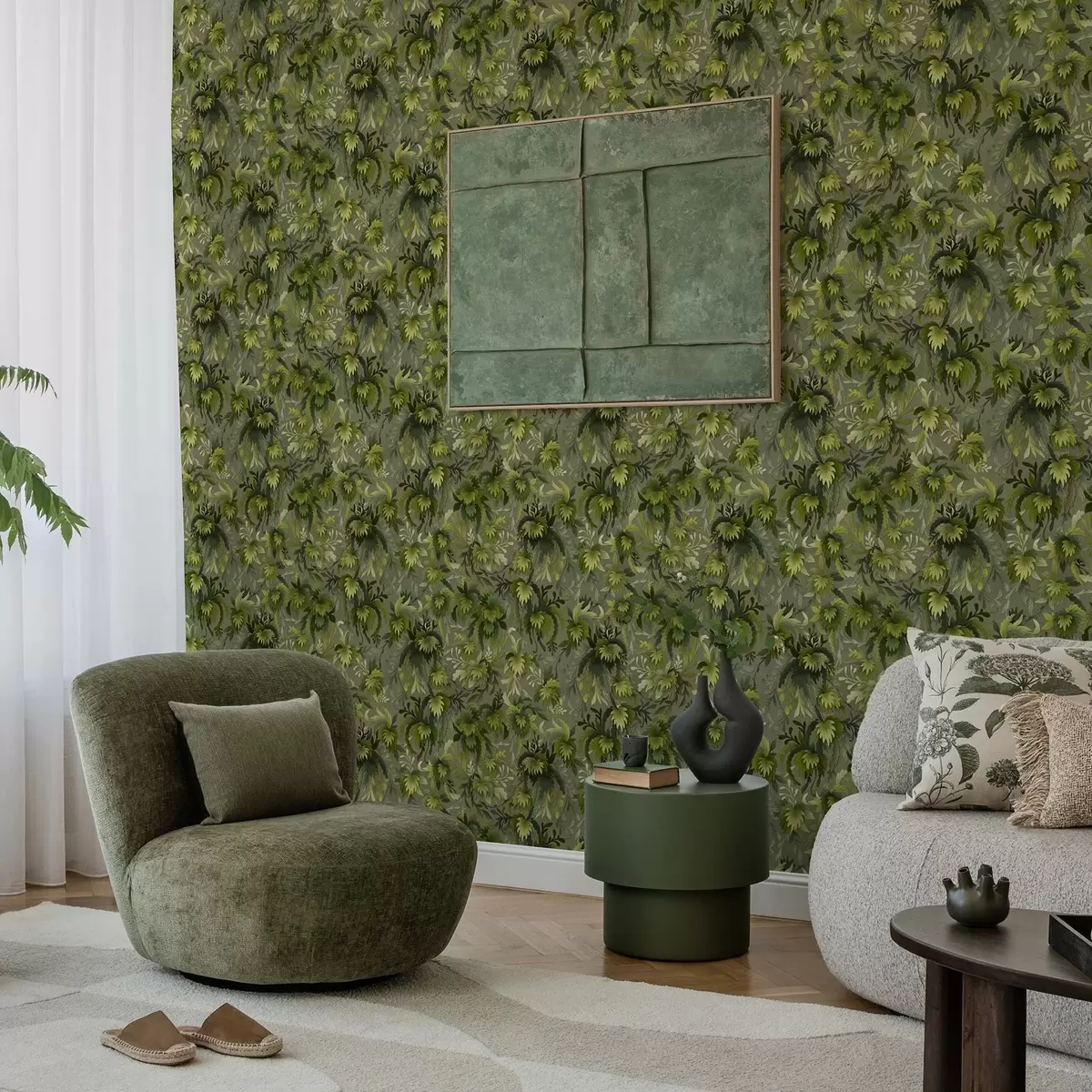 Tapete Dichtes grünes Laub auf graugrünem Hintergrund Nr. a00805v1