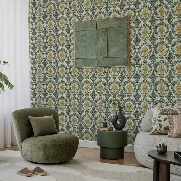 Tapete Damast mit grünen Schnörkeln auf hellem Grund Nr. a00828v1
