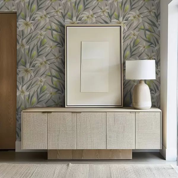 Tapete Cremefarbene Lilien mit Blättern auf grau-beigem Hintergrund Nr. a00837