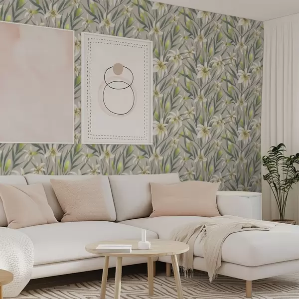 Tapete Cremefarbene Lilien mit Blättern auf grau-beigem Hintergrund Nr. a00837