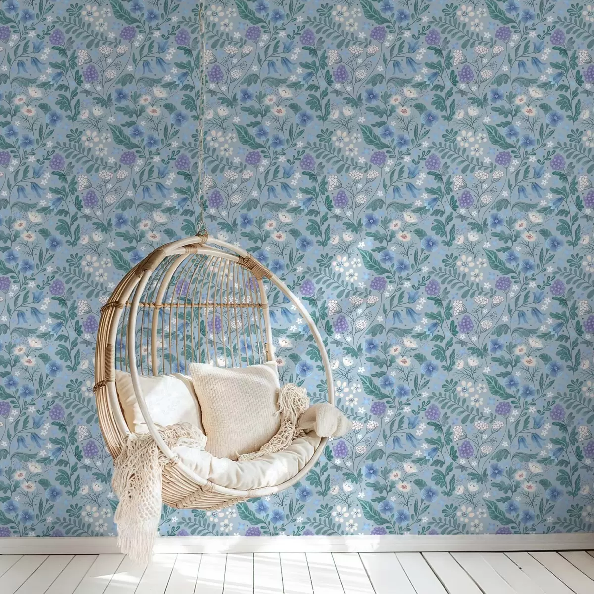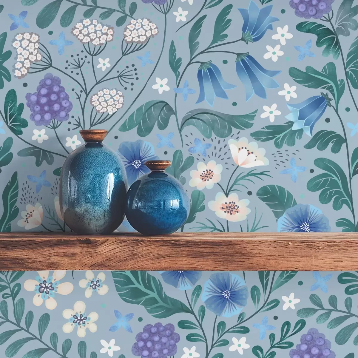 Tapete Wildblumen und Beeren auf grau-blauem Hintergrund Nr. a00849v1