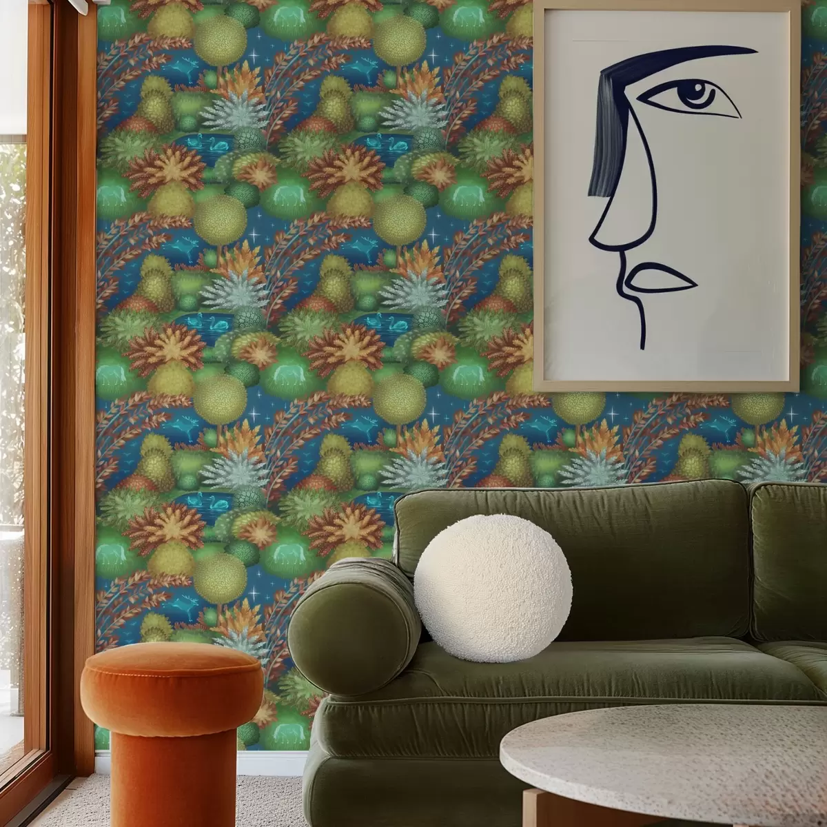Tapete Märchenhafter Nachtgarten mit einem See und leuchtenden Tieren Nr. a00851