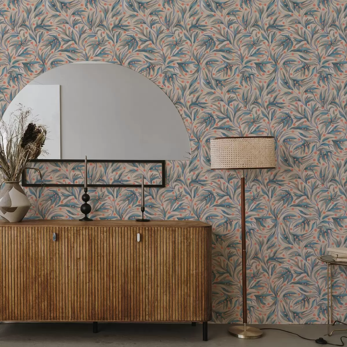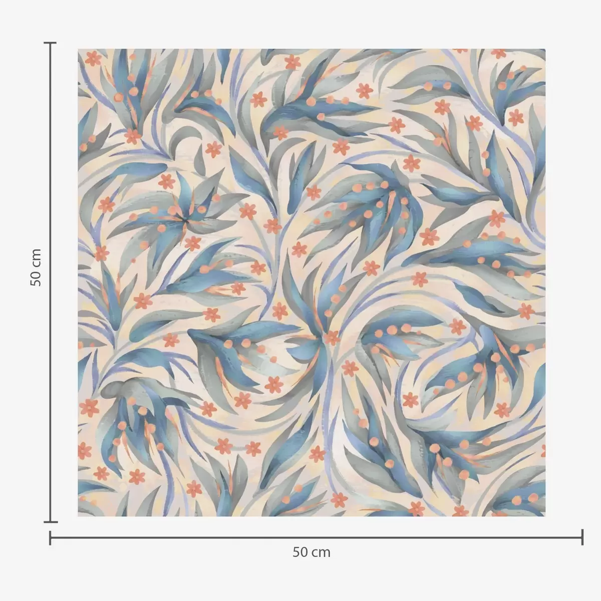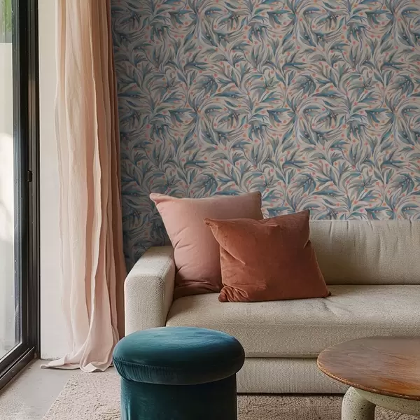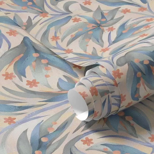 Tapete Abstrakte blaue Blätter mit korallenroten Blüten Nr. a00852