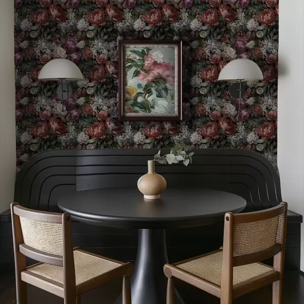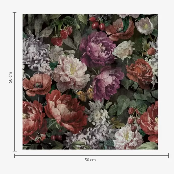 Tapete Dunkle, dramatische Pfingstrosen, Beeren und Schmetterling auf schwarzem Hintergrund Nr. a00862