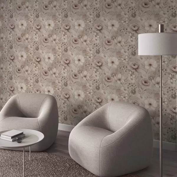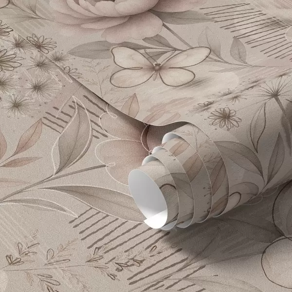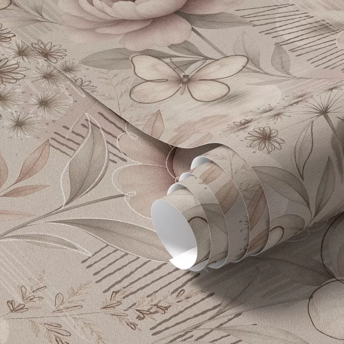 Tapete Sepia-beige Blumenmuster mit Schmetterlingen und linearen Akzenten Nr. a00870