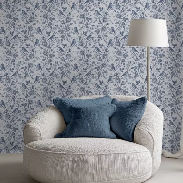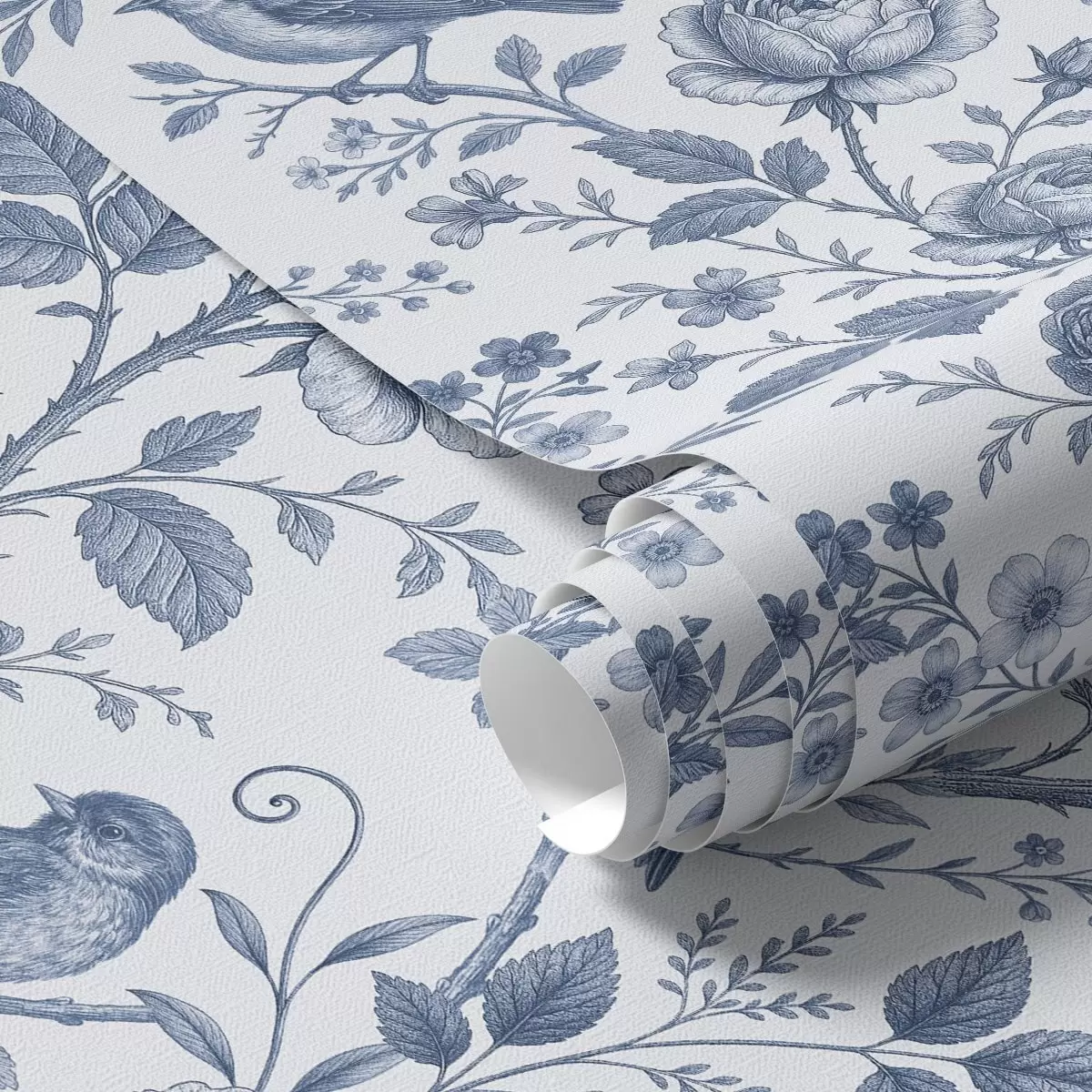 Tapete Blaue Toile-Vögel und Rosen auf weißem Hintergrund Nr. a00873