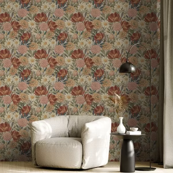 Tapete Vintage-Gartenblüten in warmem Terrakotta und Pfirsich Nr. a00874