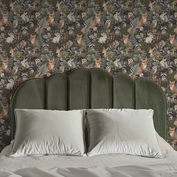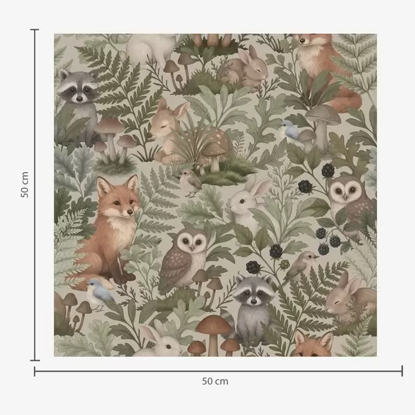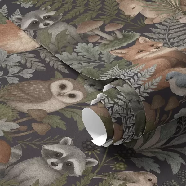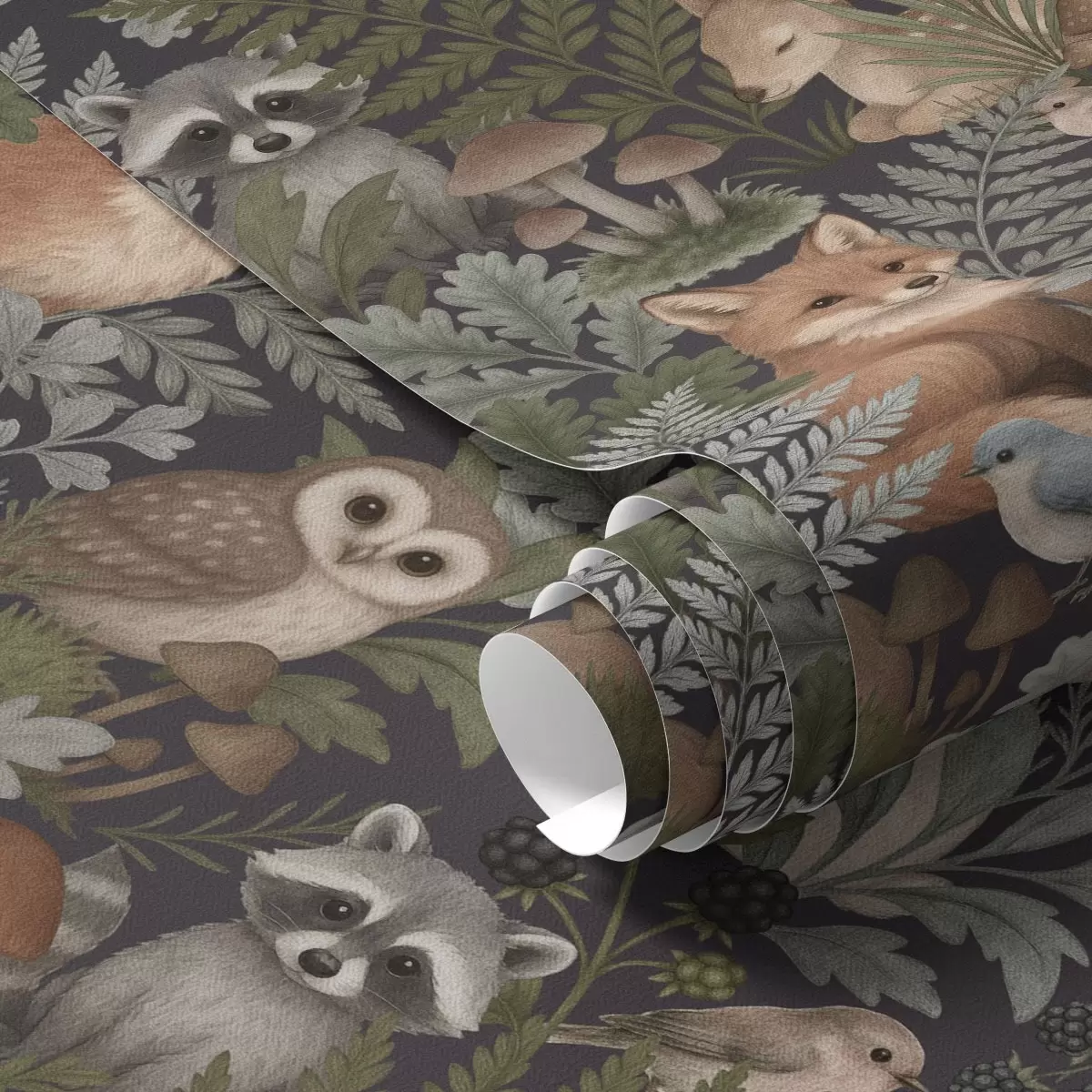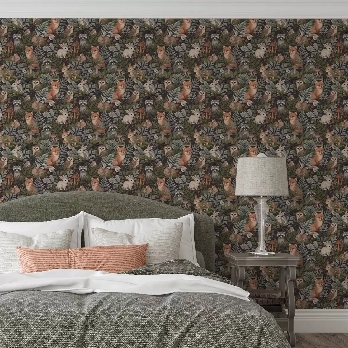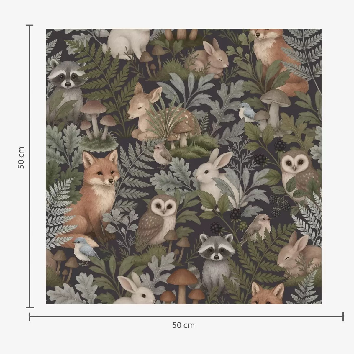 Tapete Waldtiere und Farne auf tiefem Anthrazit Nr. a00880