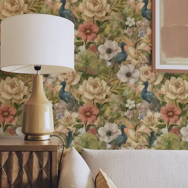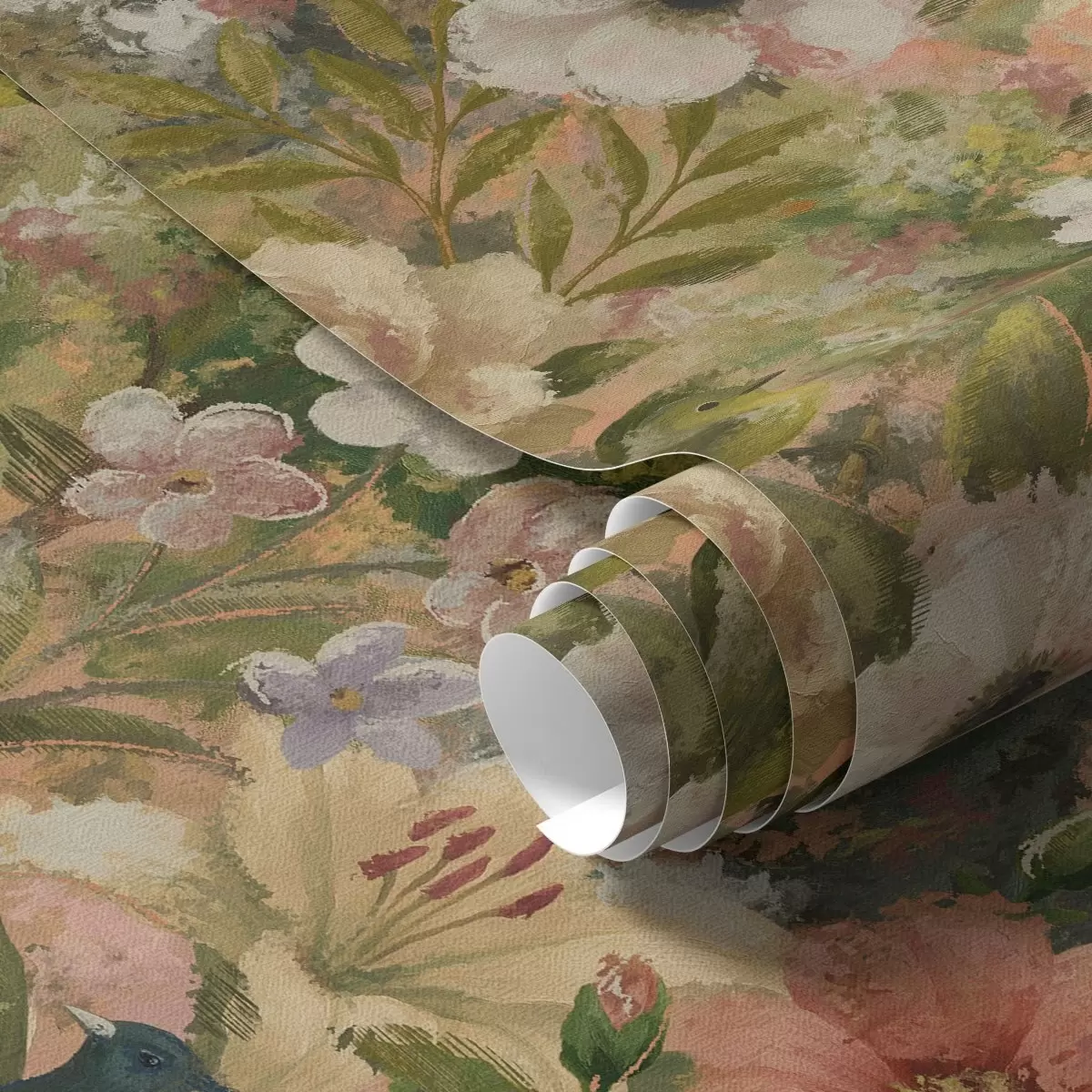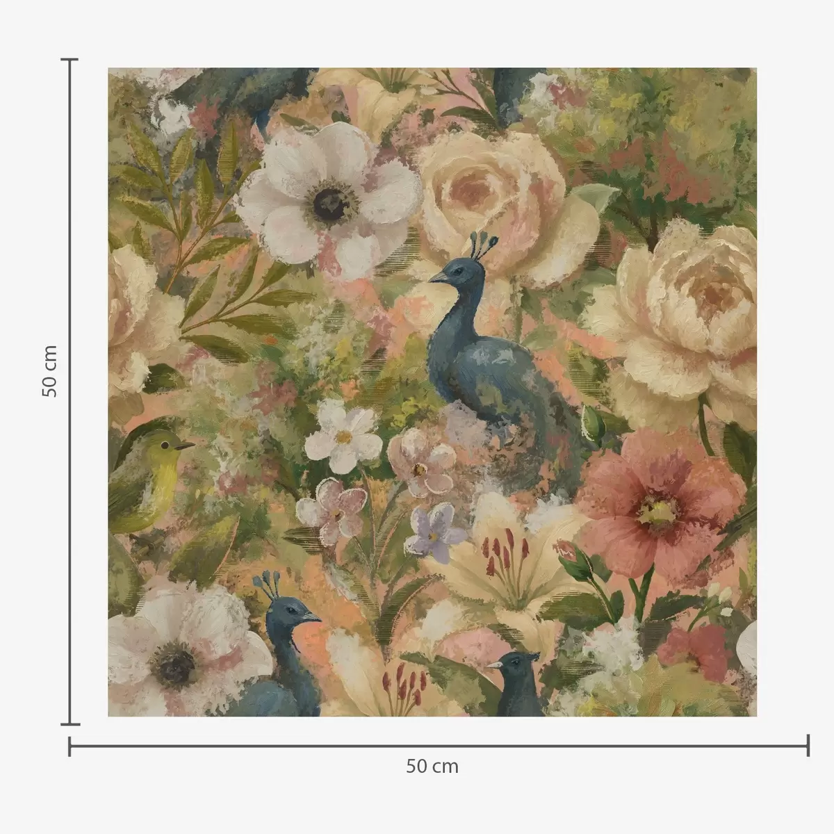 Tapete Malerischer Garten mit Pfauen und großen Blumen Nr. a00885