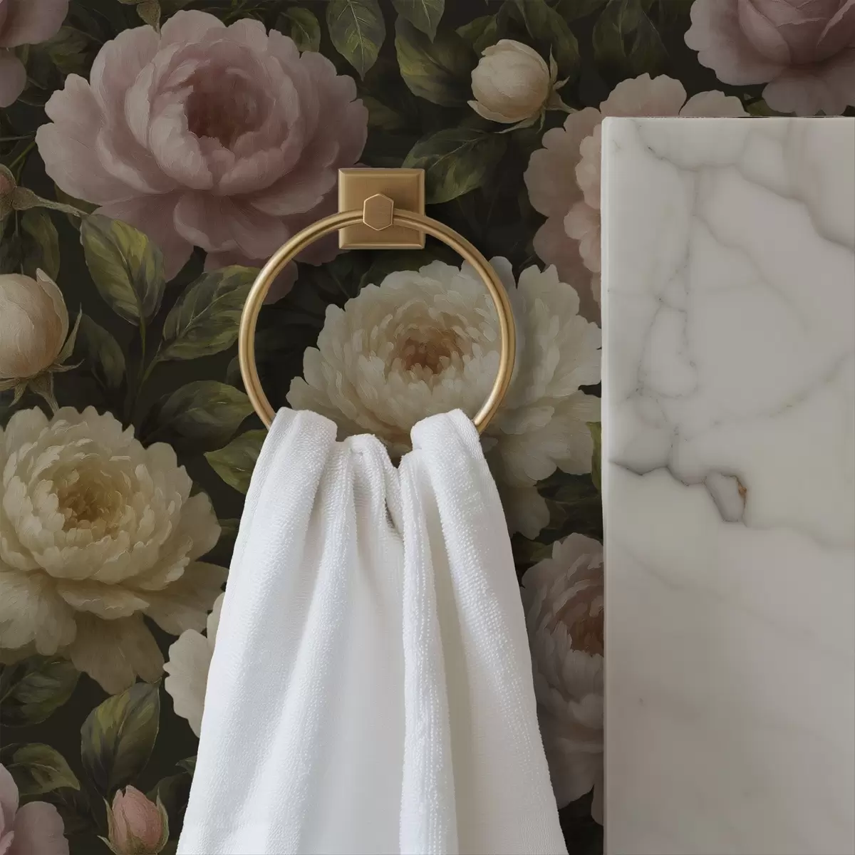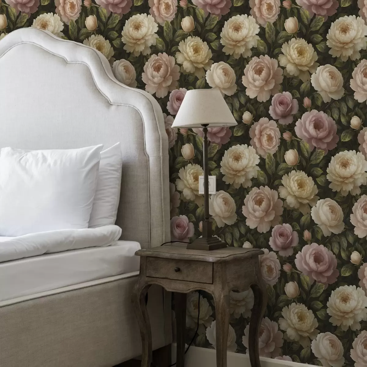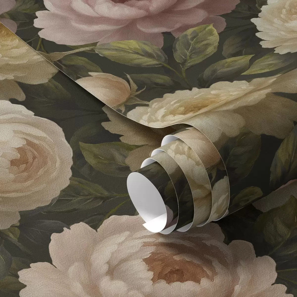 Tapete Romantische Pfingstrosen auf dunklem botanischem Hintergrund Nr. a00893