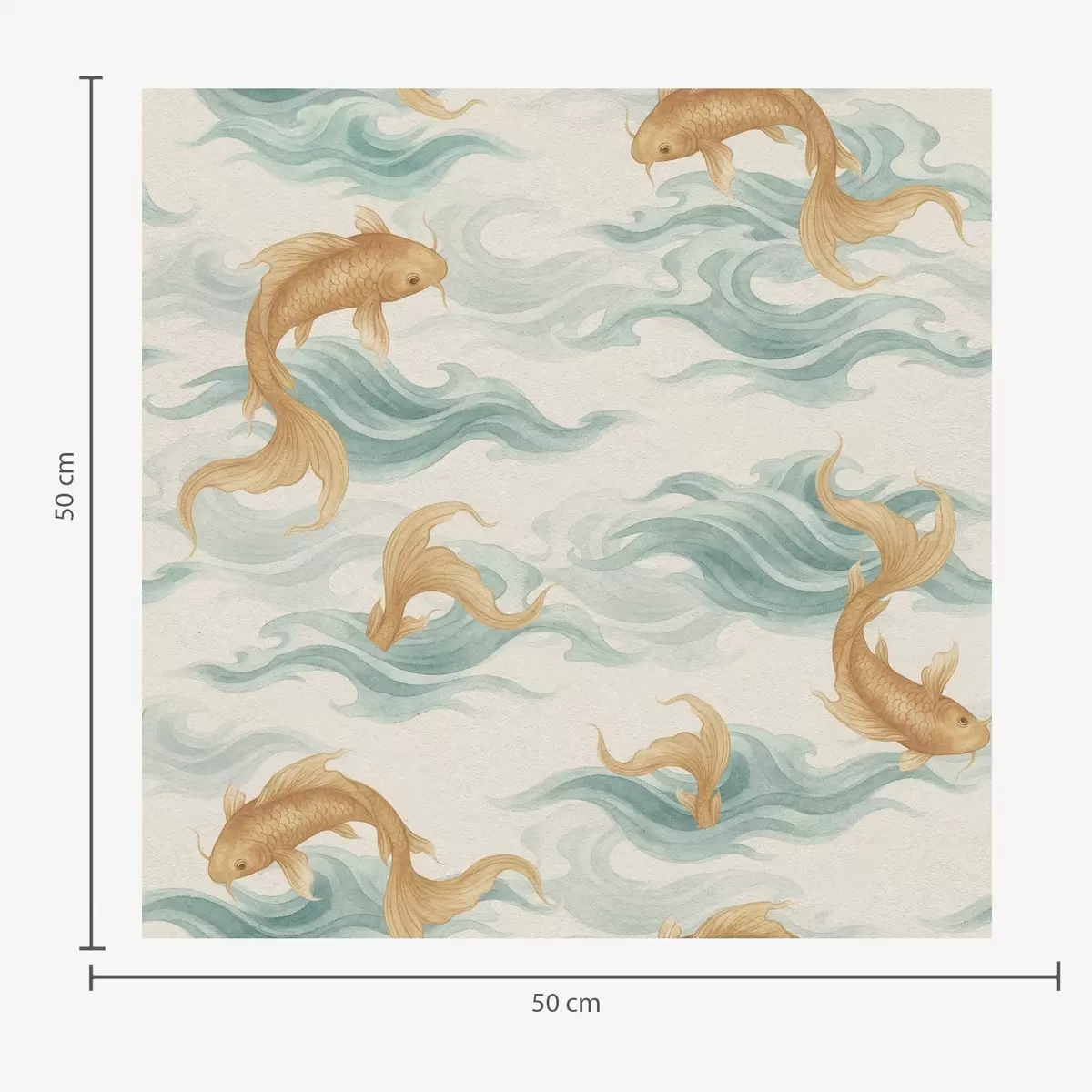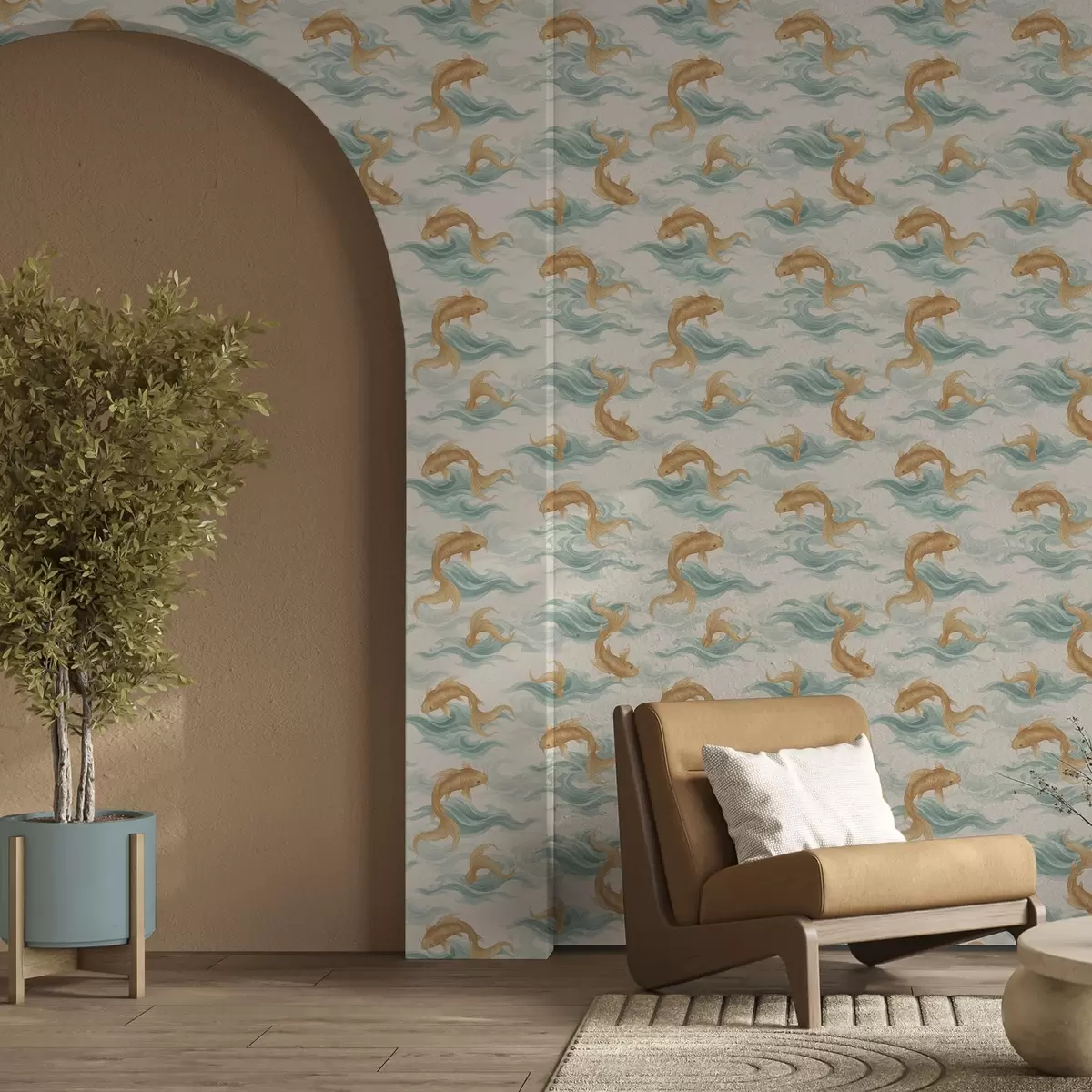 Tapete Bernsteinfarbener Koi-Fisch schwimmt in sanften türkisfarbenen Wellen Nr. a00894
