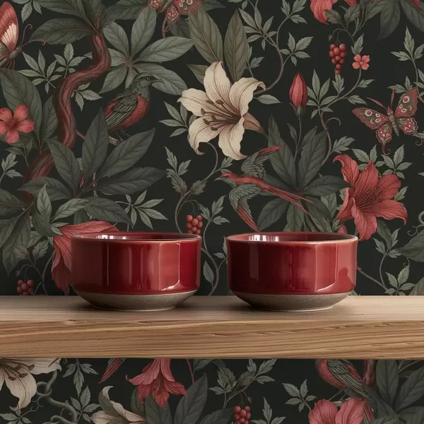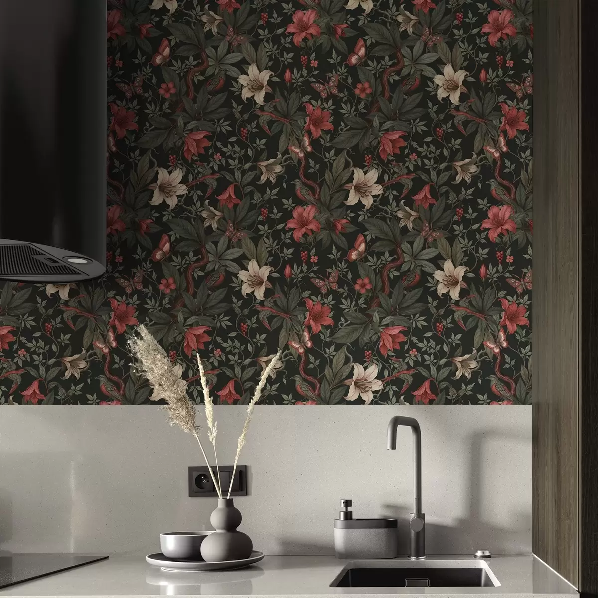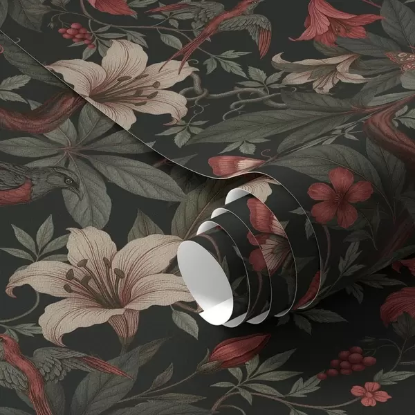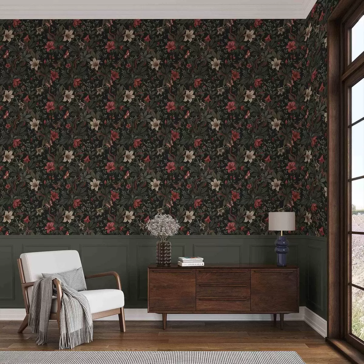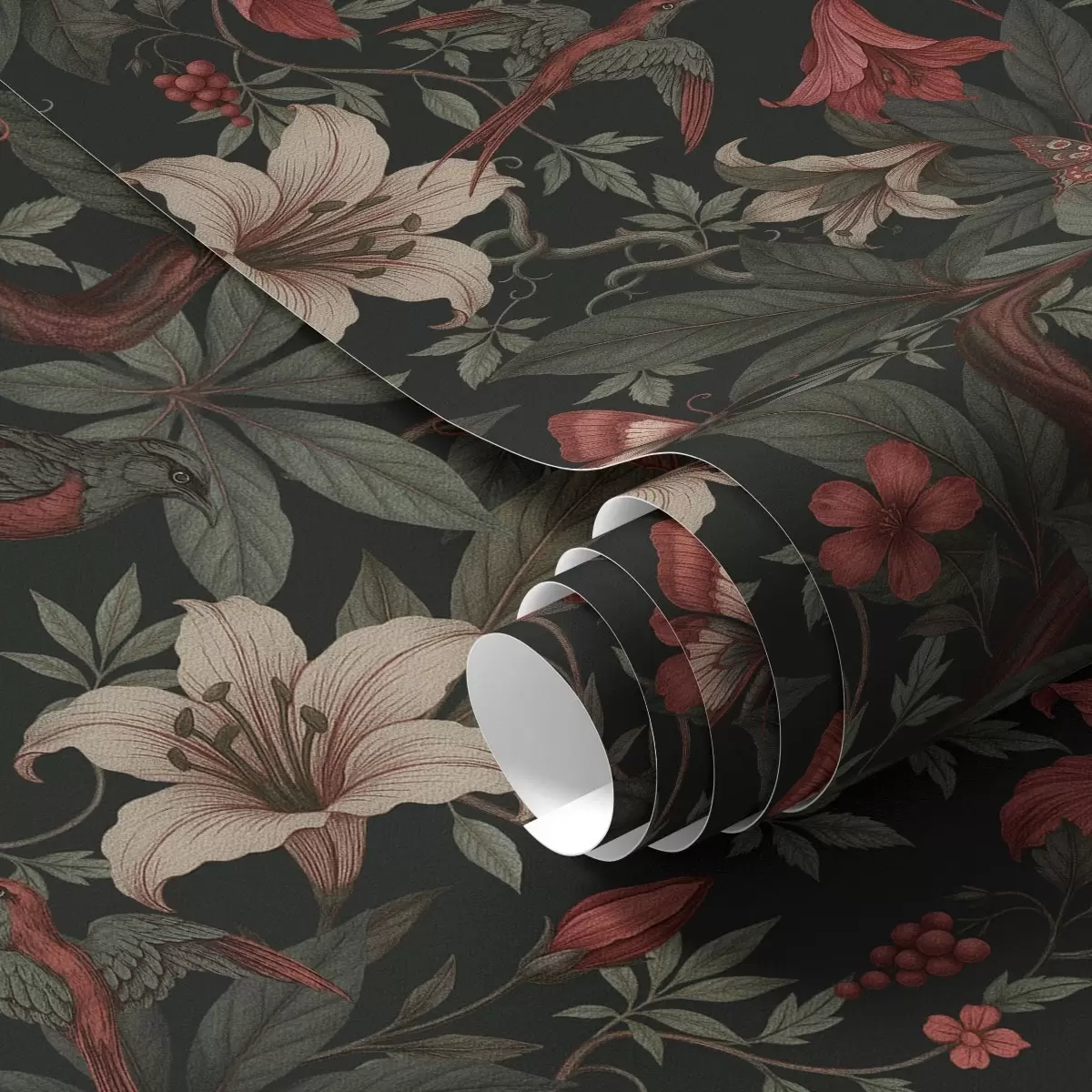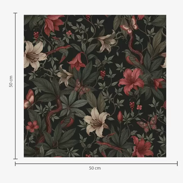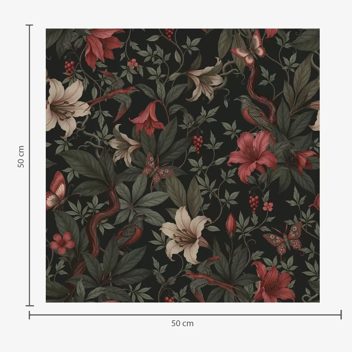 Tapete Dunkle Dschungelblumen mit Vögeln und Schmetterlingen Nr. a00895