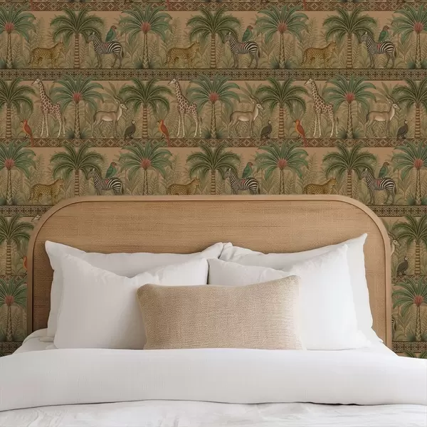 Tapete Dekorative Savannentiere zwischen Palmen und Bordüren Nr. a00898
