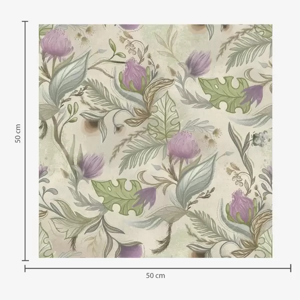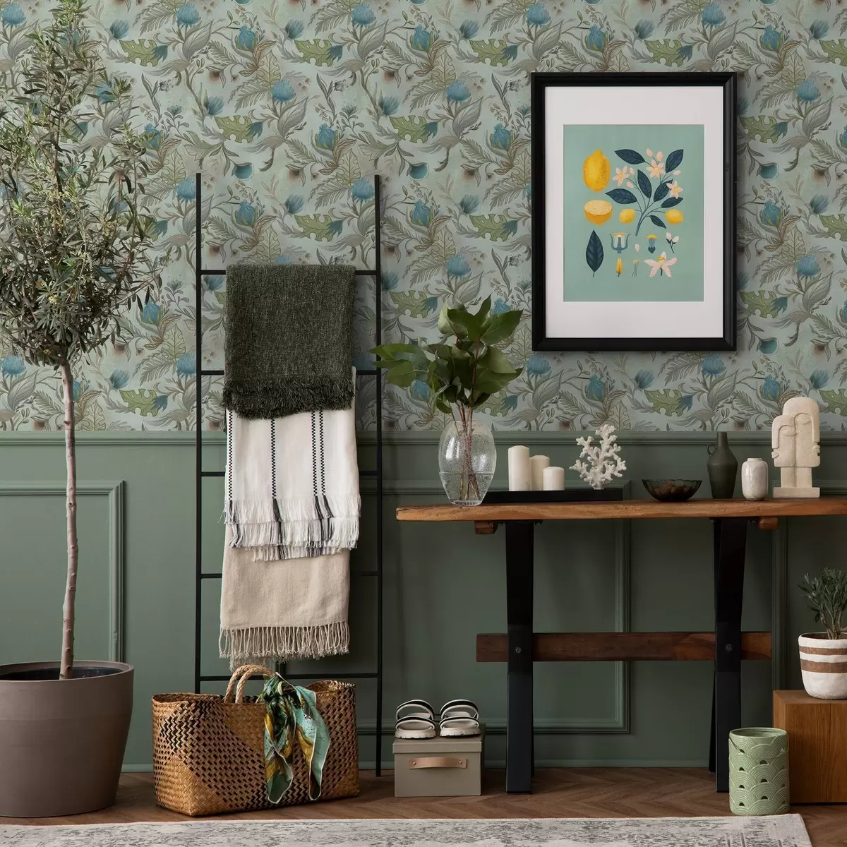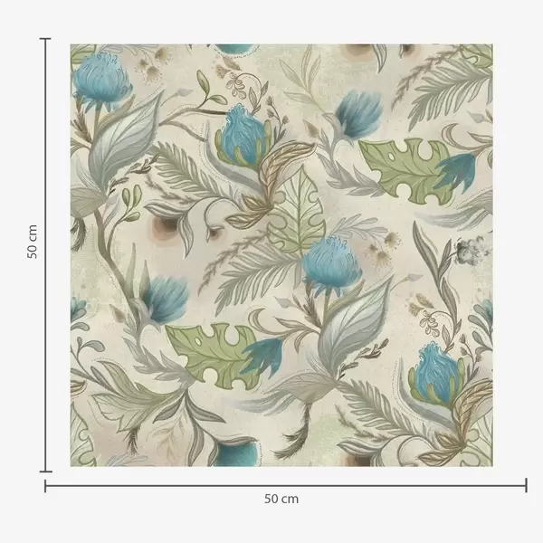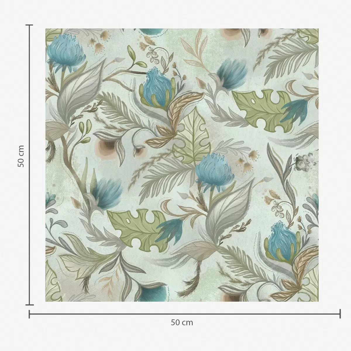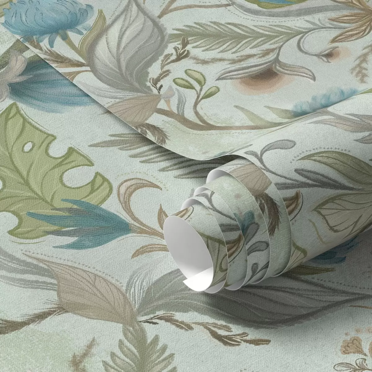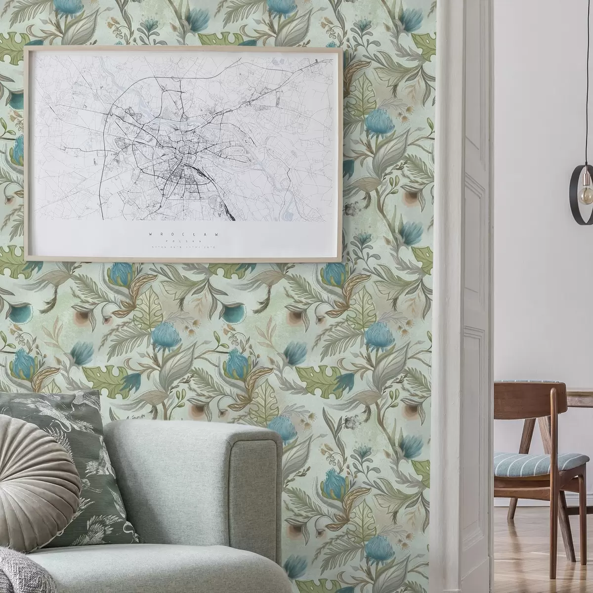 Tapete Blaue Blumen und Grünpflanzen auf einem sanften Minz-Hintergrund Nr. a00930v1