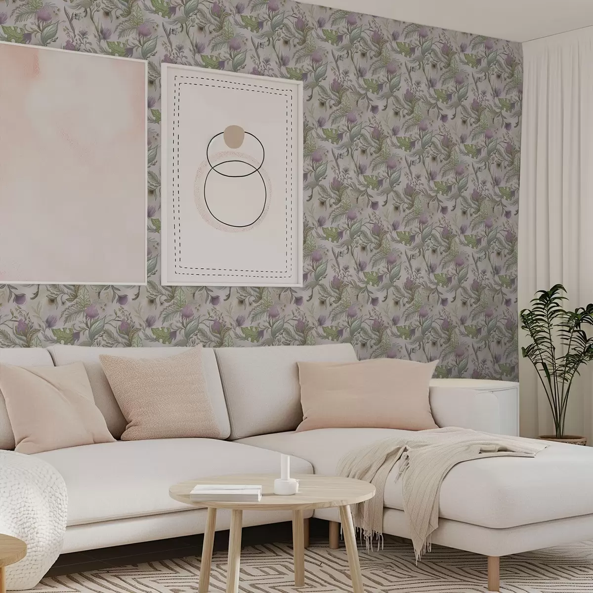 Tapete Lila Wildblumen und Blätter auf einem pudrigen Hintergrund Nr. a00930v3