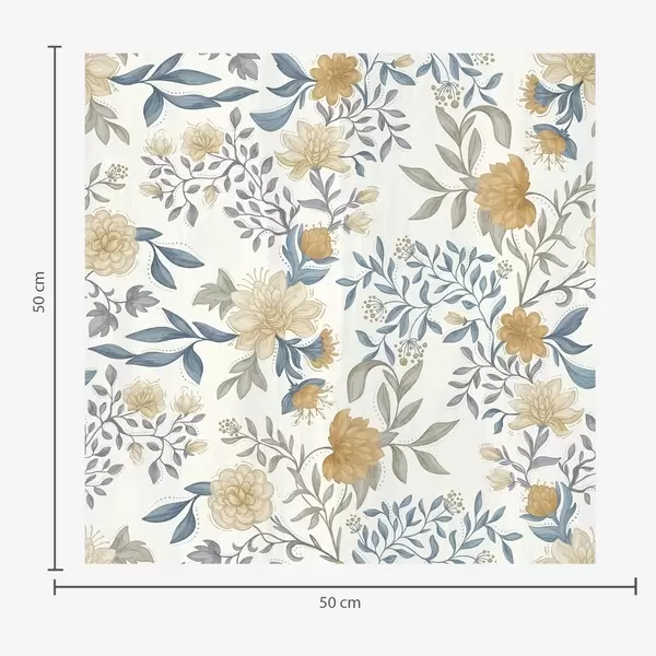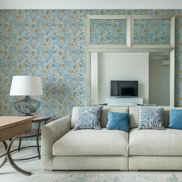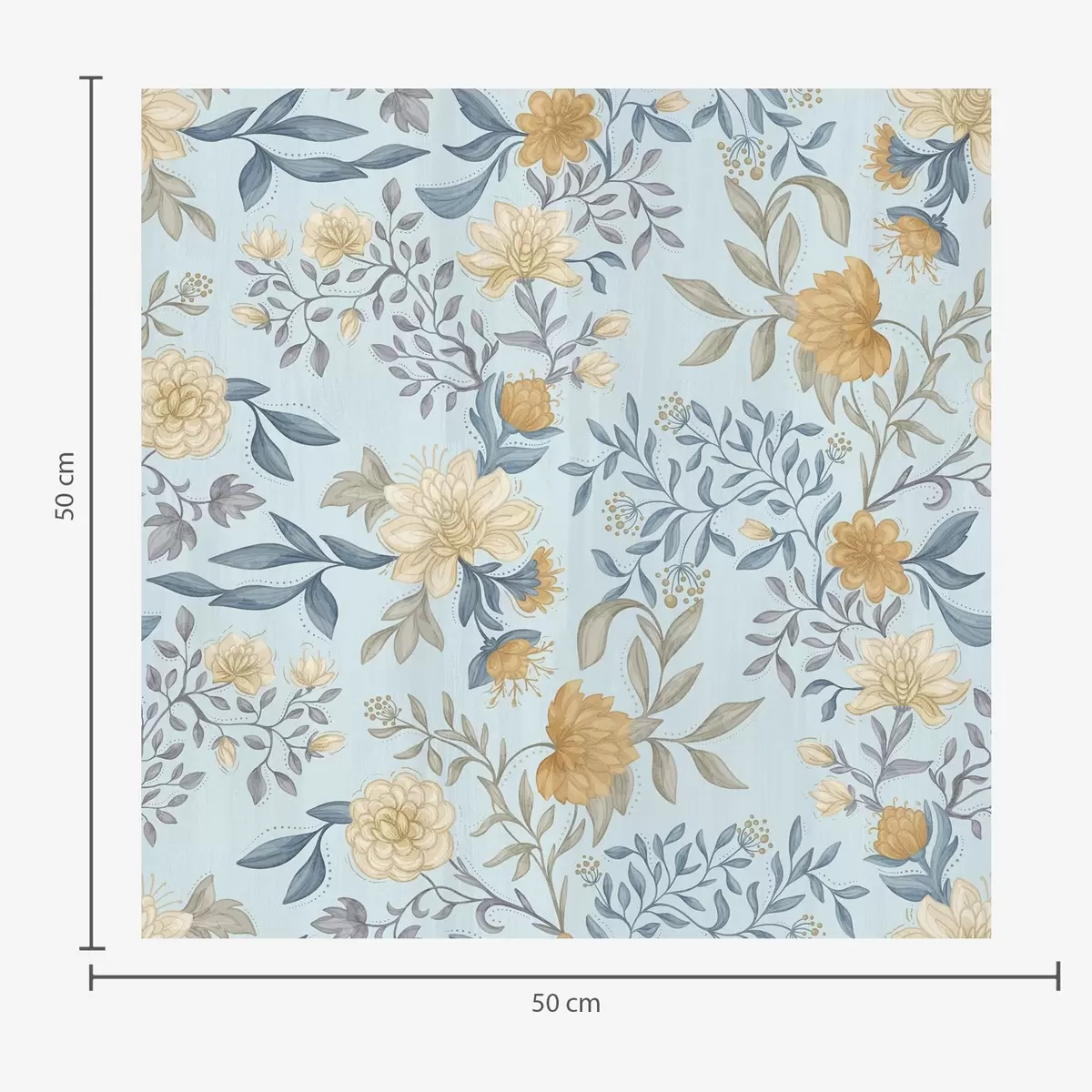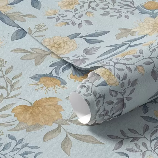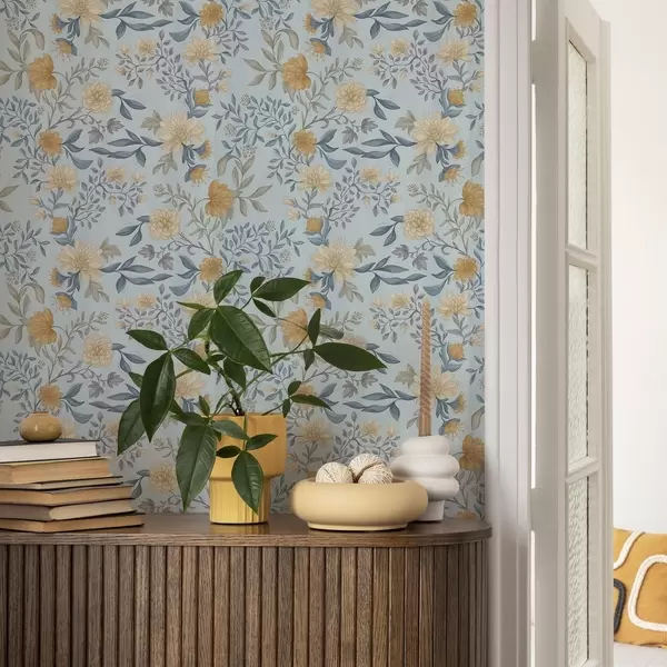 Tapete Gelbe und blaue Blumen mit Blättern auf himmelblauem Hintergrund Nr. a00934