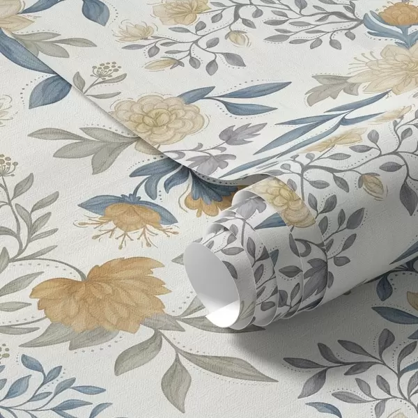 Tapete Gelbe Blumen und blaugrünes Laub auf milchig-weißem Hintergrund Nr. a00934v2