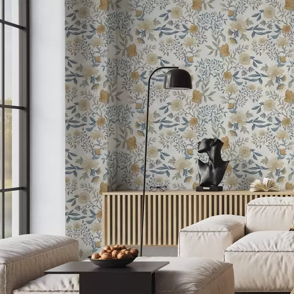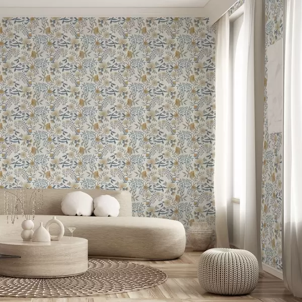 Tapete Gelbe Blumen und blaugrünes Laub auf milchig-weißem Hintergrund Nr. a00934v2