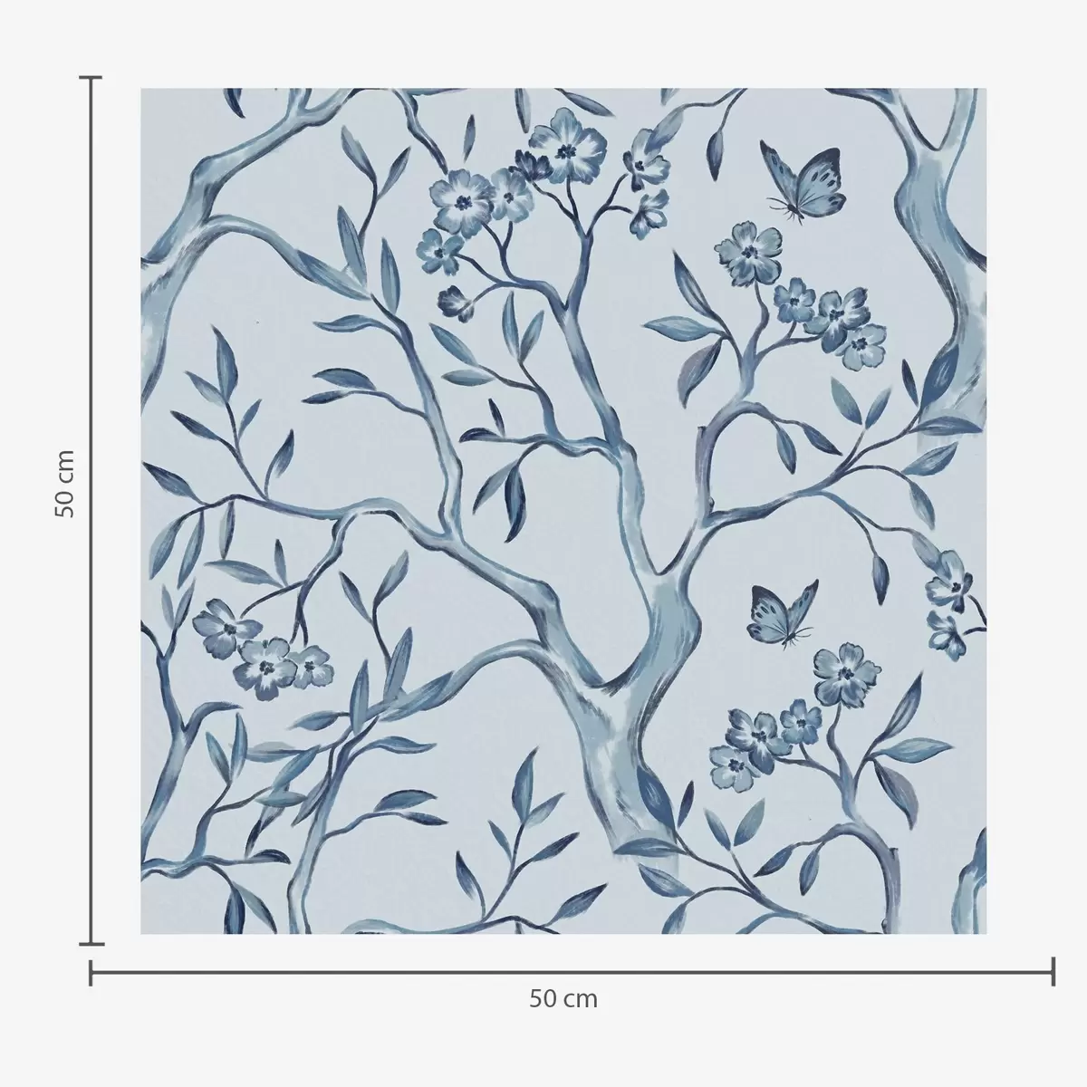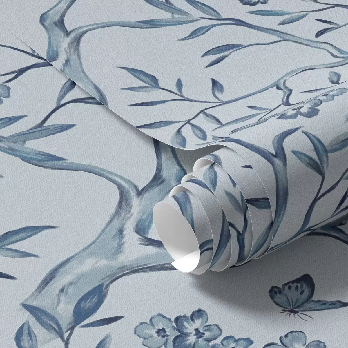 Tapete Aquarellblaue Zweige mit Blumen und Schmetterlingen auf hellem Hintergrund Nr. a00951