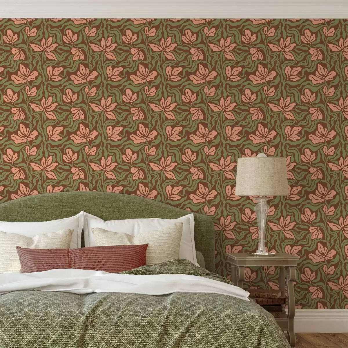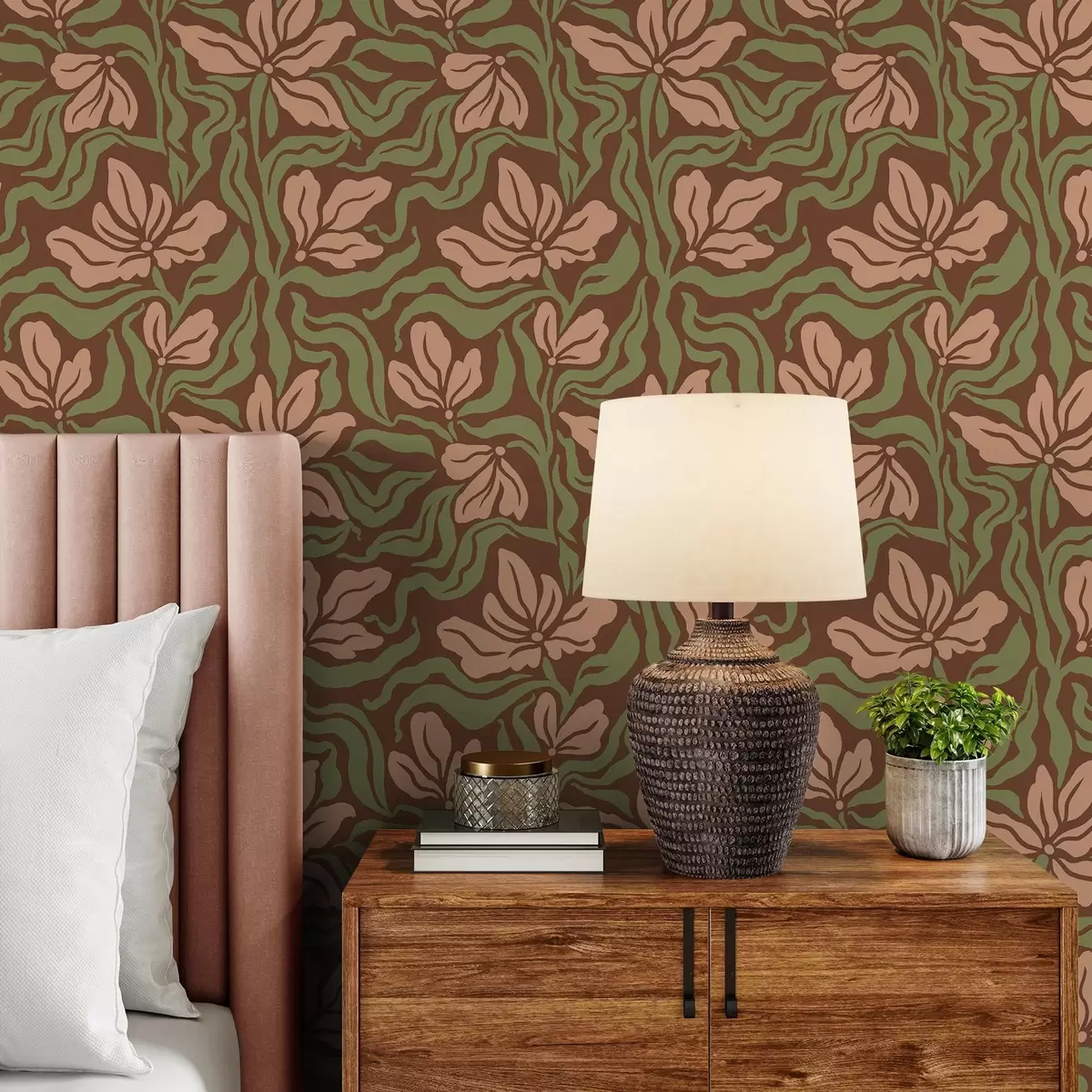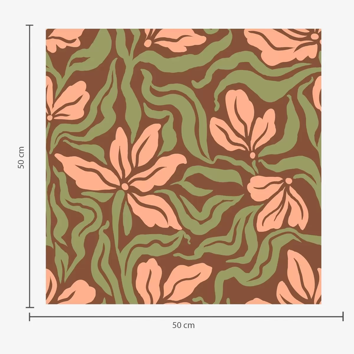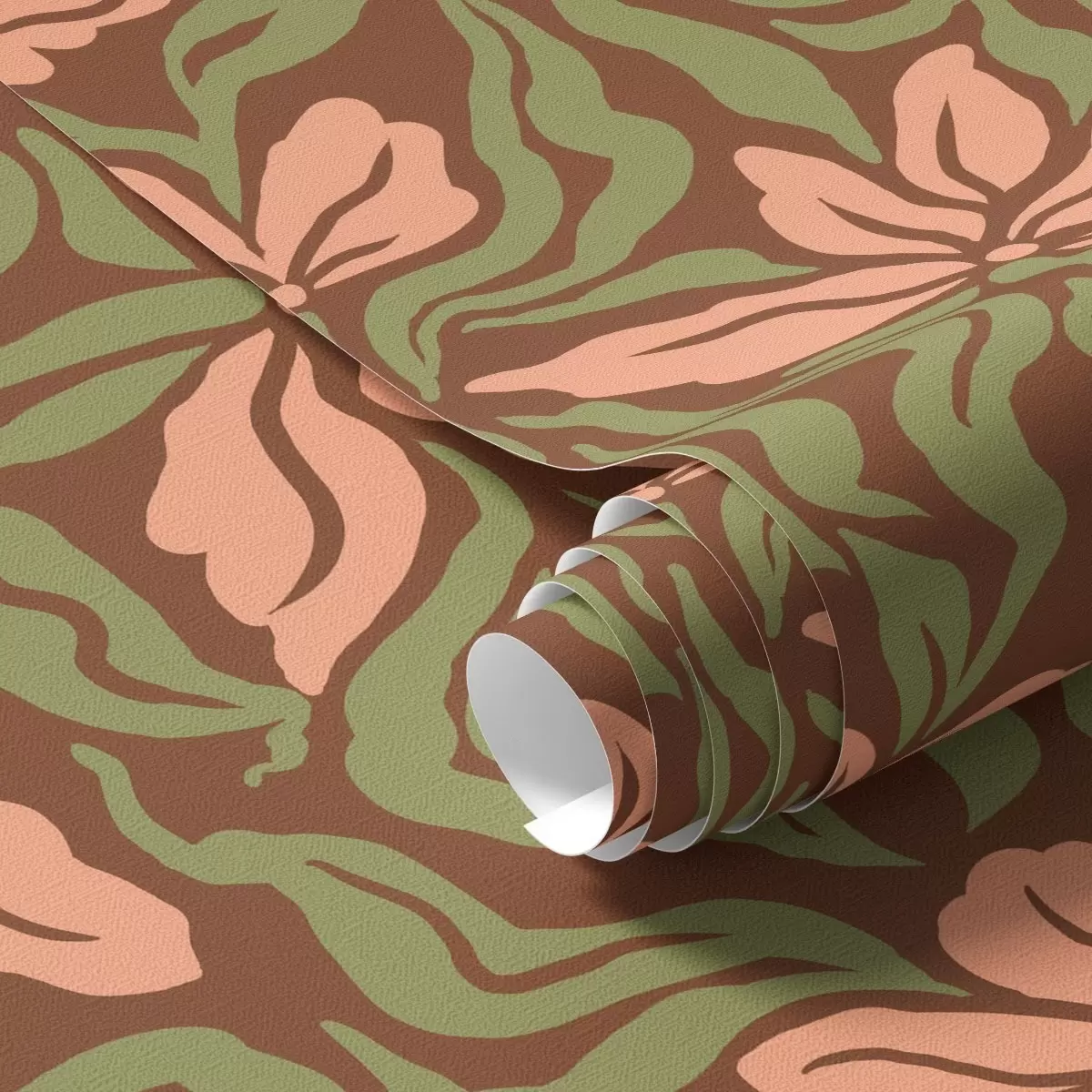 Tapete Pfirsichblüten und Grünpflanzen auf tiefbraunem Hintergrund Nr. a00958v2
