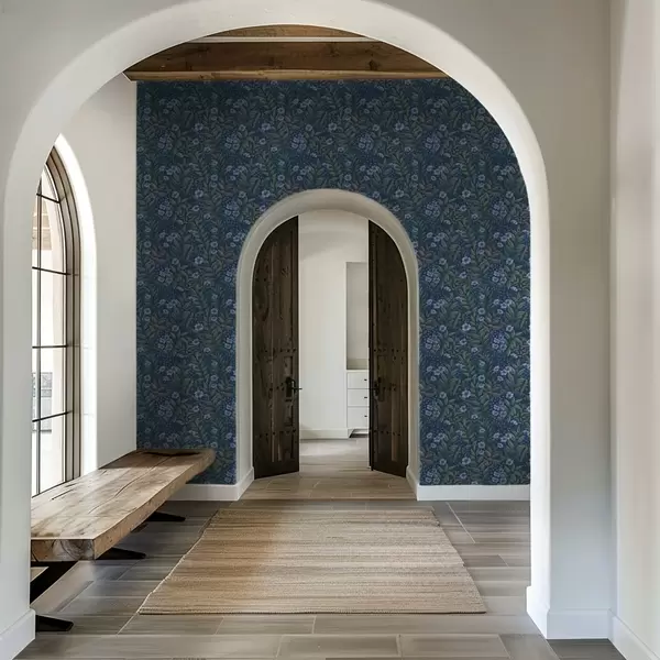 Tapete Mitternachtsblaue Beeren und weiße Blüten in dichtem Laub Nr. a00994