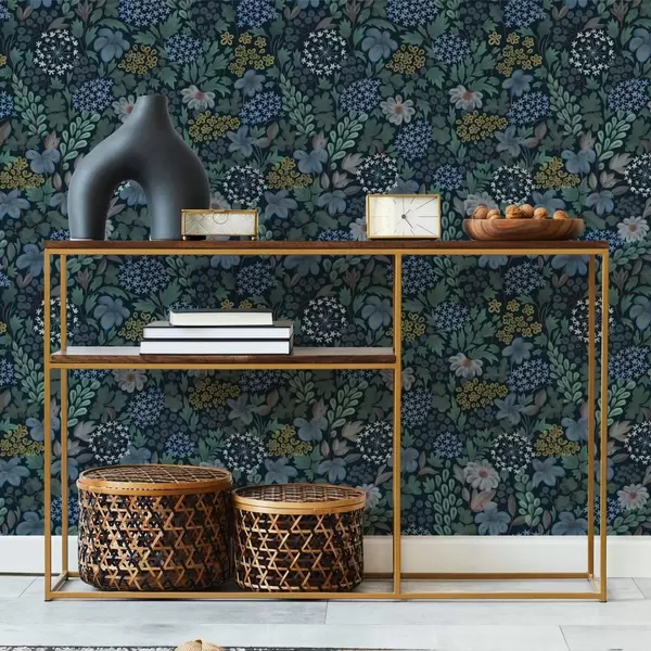 Tapete Nachtgarten mit blauen Lilien, Beeren und wildem Grün Nr. a00996
